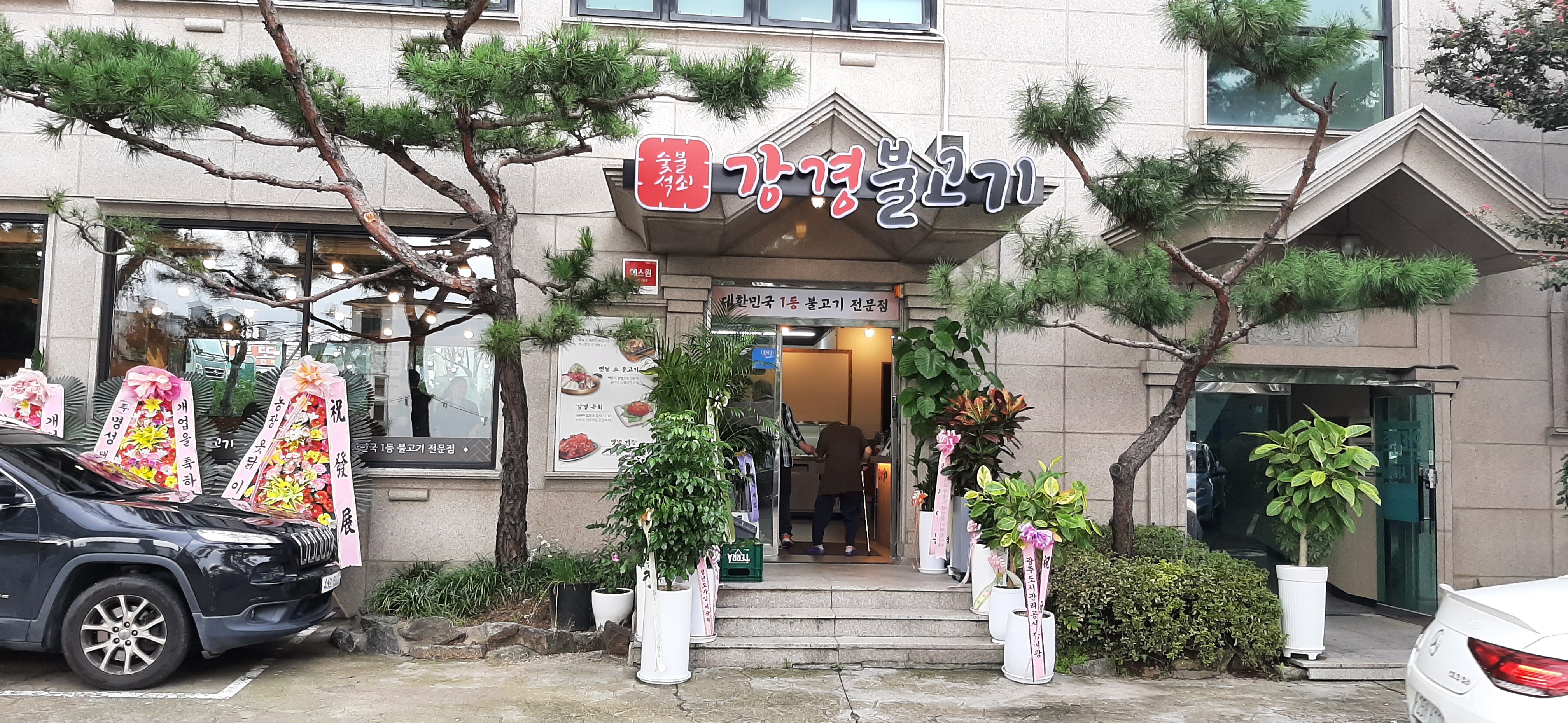 오늘은 점심으로 무엇을 먹을까 생각하면서 운전하는 중에 강경불고기 간판이 눈에 들어와서, 어머니께 말씀드리고, 불고기를 먹으러 간다. 개업한 지 얼마 안 됐는지 입구에 화환이 많이 있다.