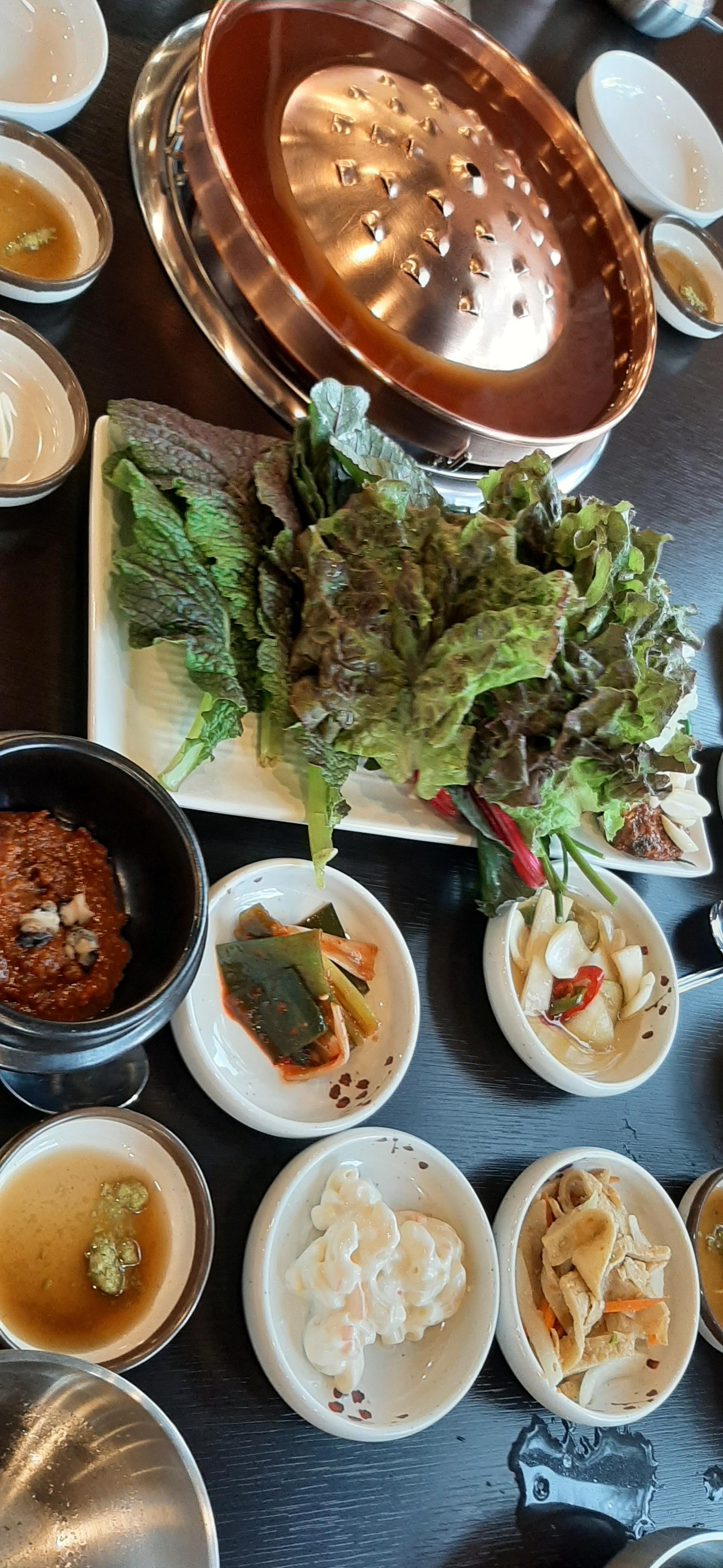 가게는 넓고, 손님들도 많이 있고, 셀프코너에 야채와 반찬들이 있다. 야채를 좋아하는 나는 깻잎, 상추, 마늘을 많이 가져왔다. 참고로 나는 식당에 가면, 내가 가져온 반찬은 남기지 않고, 다 먹는다.