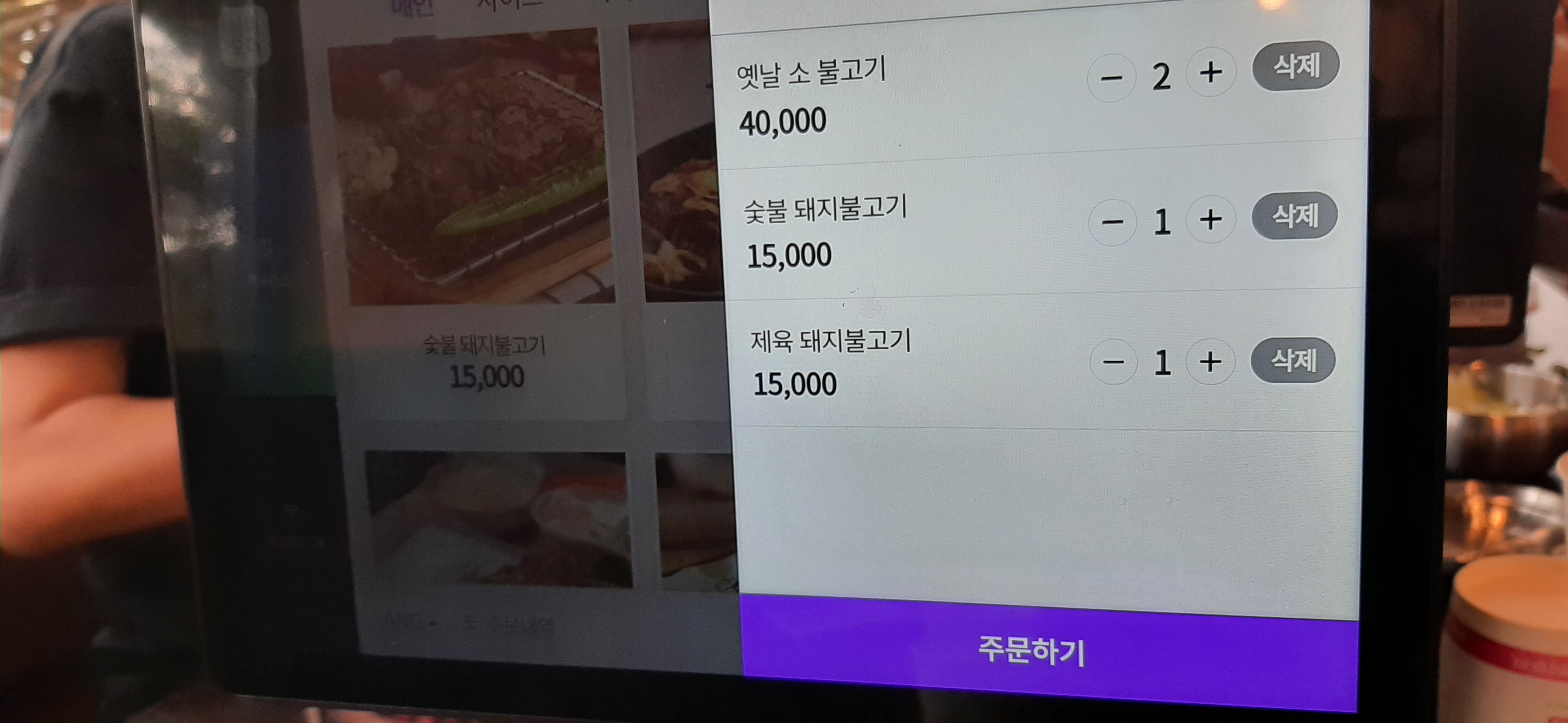 입구에 들어서니 종업원들이 환하게 웃으면서 큰소리로 인사를 한다. 종업원이 안내하는 테이블에 앉아서 키오스크로 주문을 한다. 옛날 소불고기 2인분, 숯불 돼지불고기 1인분, 제육 돼지불고기 1인분을 주문했다. 나는 키오스크로 주문하는 것을 많이 해서 이제는 능숙하게 잘한다.