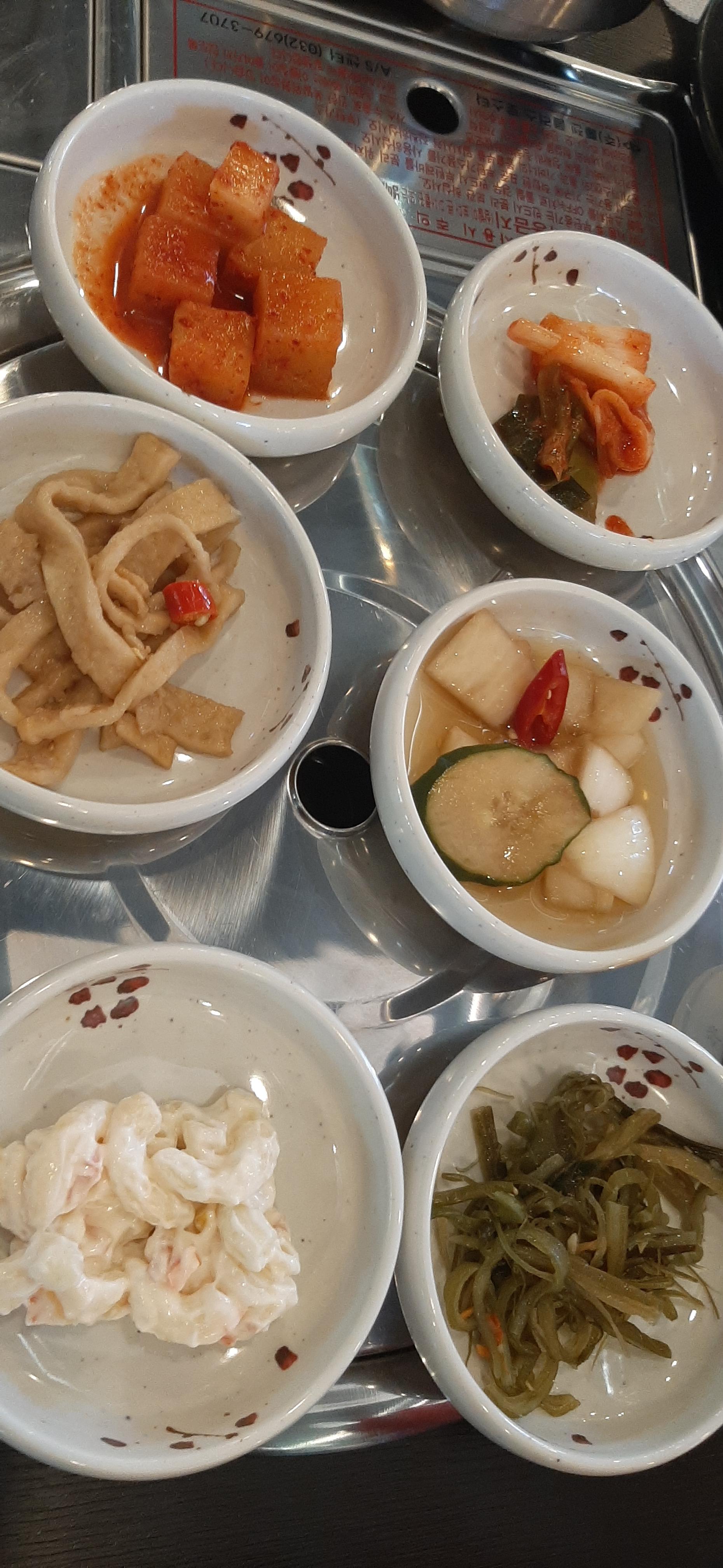 기본 반찬이 나온다. 깍두기, 대파김치, 어묵볶음 등이 나오고, 나는 내가 좋아하는 대파김치를 맛나게 먹는다.