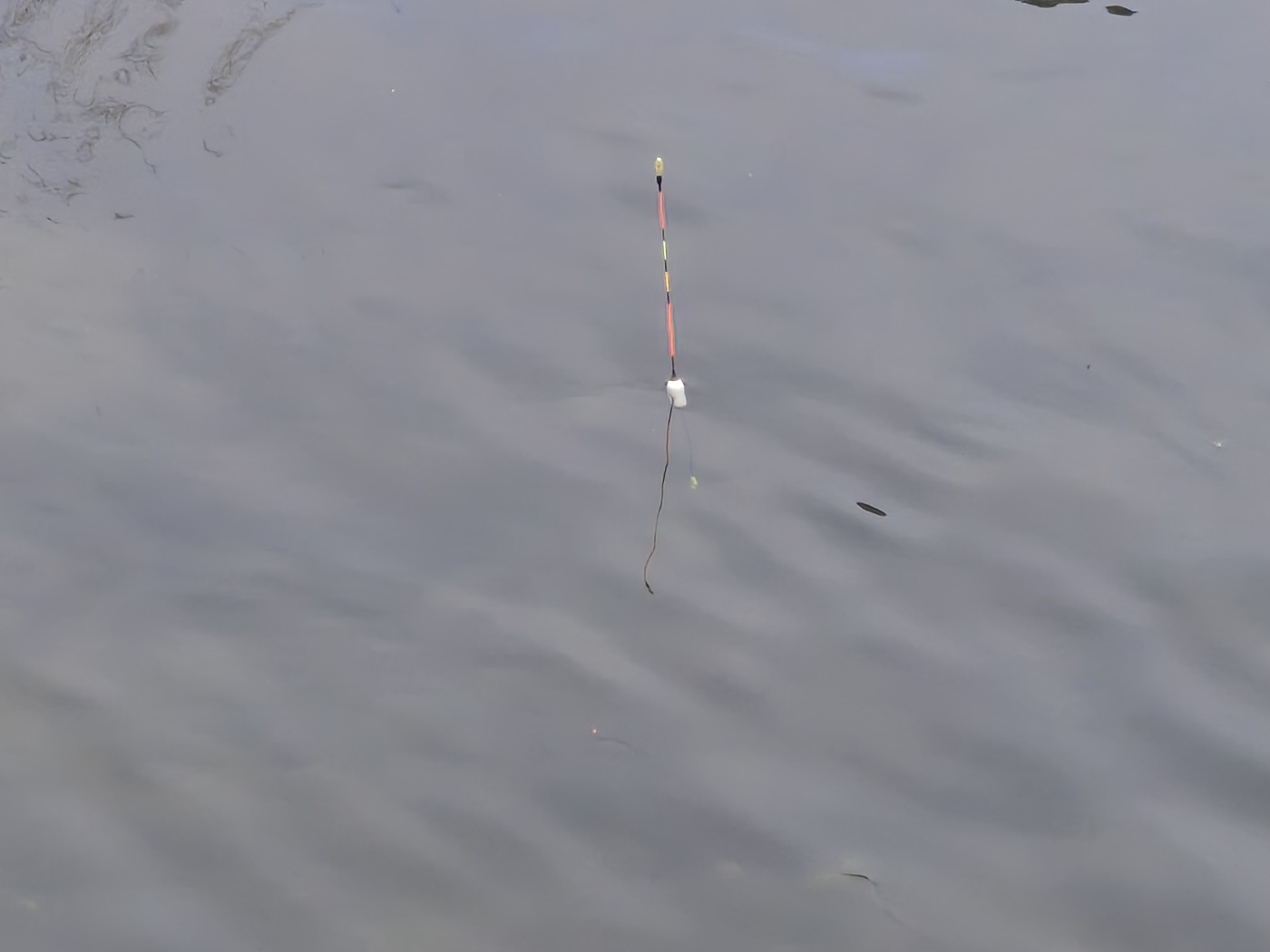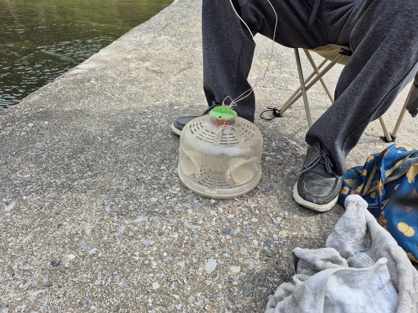 후배가 적당한 장소에 어항을 넣고, 낚싯대에 찌를 조정하고, 떡밥을 낚싯바늘에 매달아서 물에 던진다.