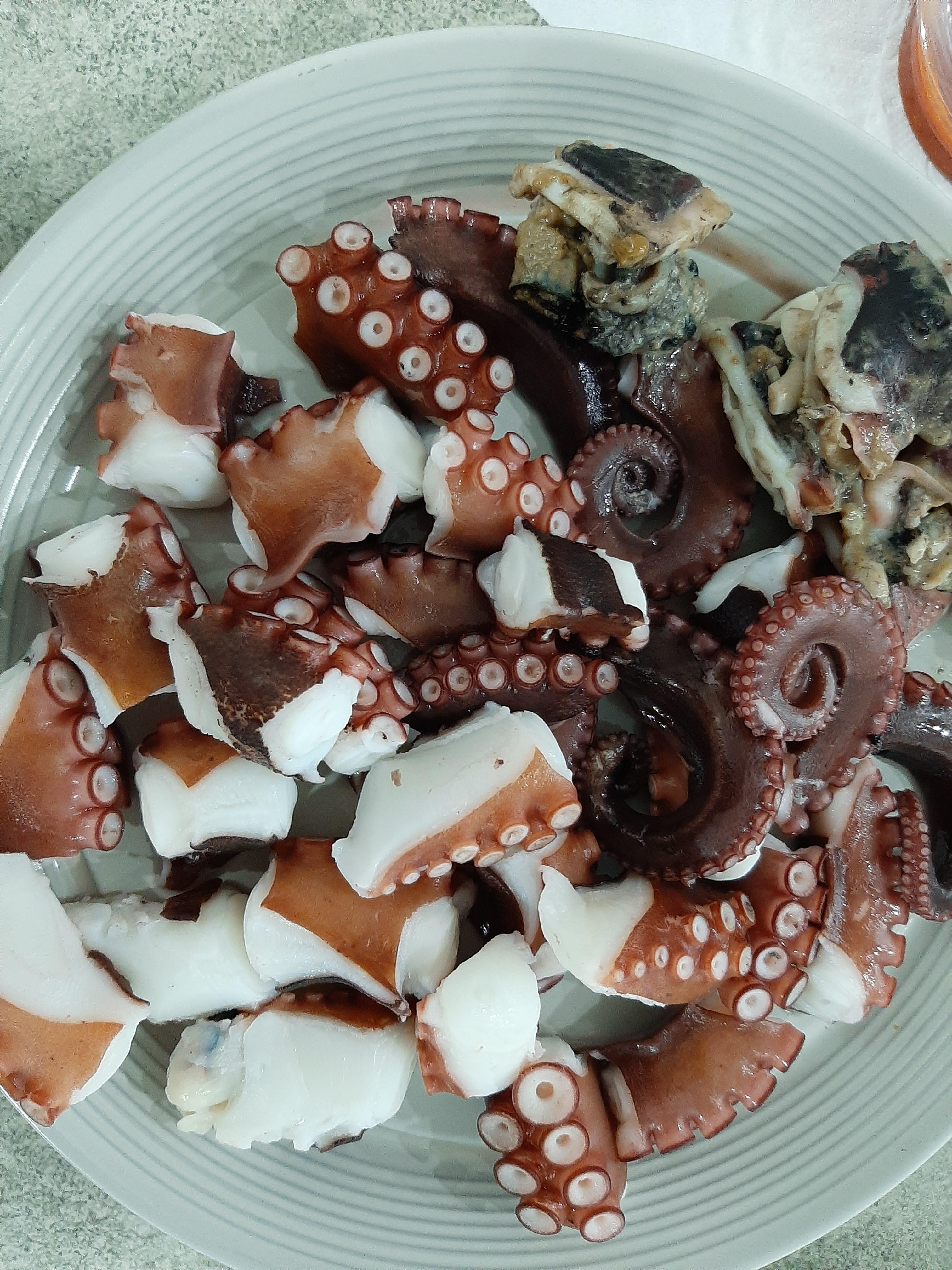 문어숙회를 만들기 위하여 냄비에 물을 가득 넣고 끓인다. 나는 조리를 하고, 박은 상을 차리고, 우리의 기사 홍은 좀 쉰다.