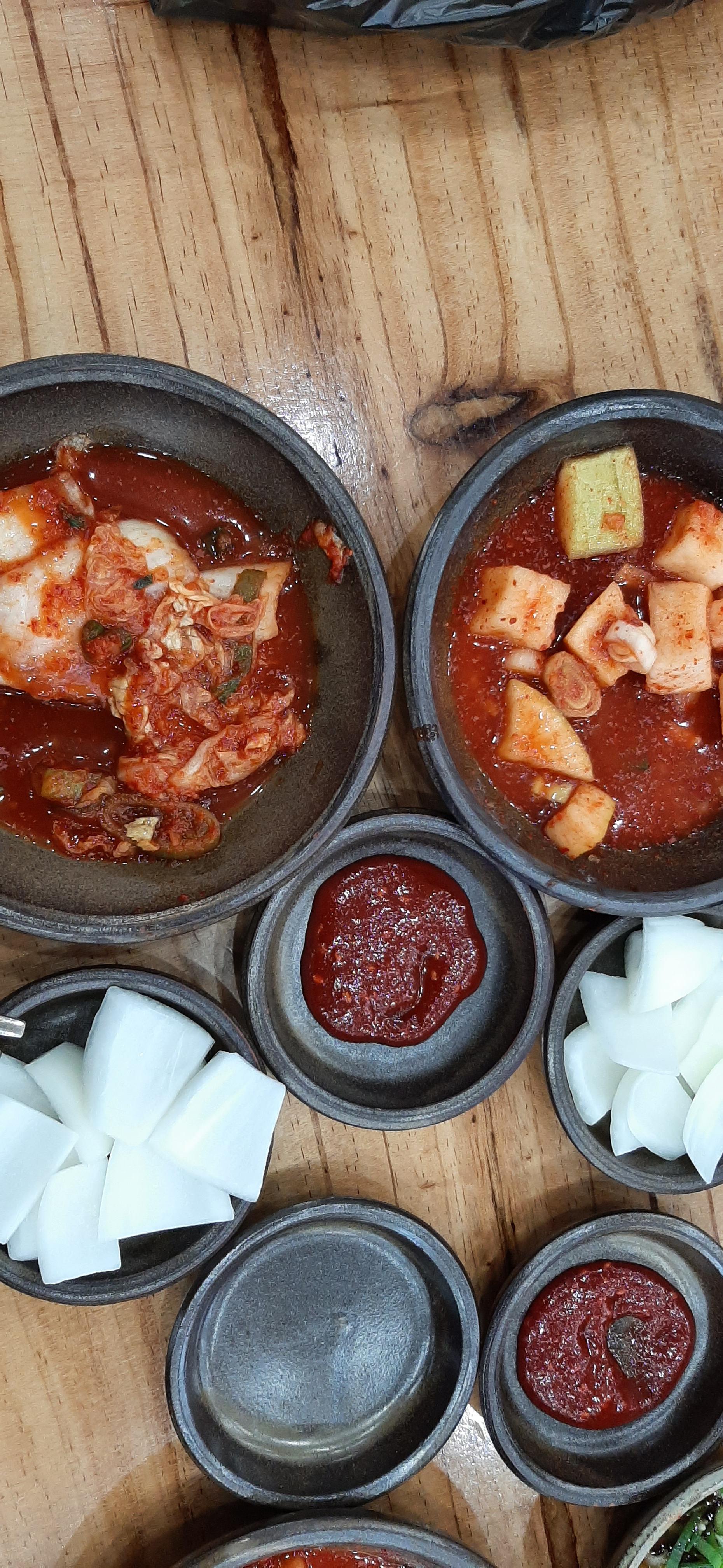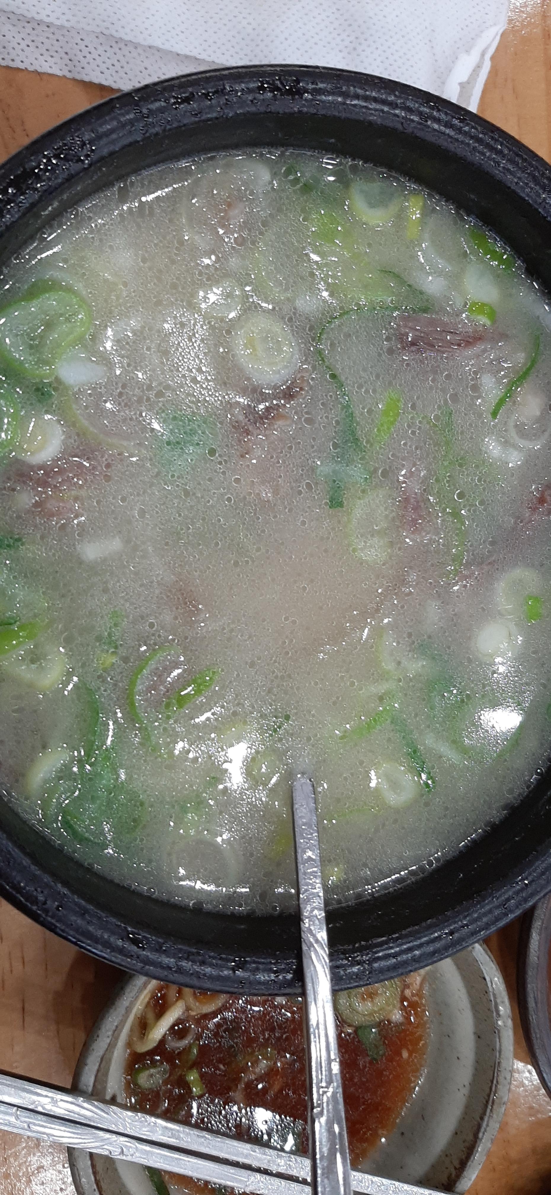 보통으로 3개 주문하니 깍두기, 겉절이 김치, 양파와 고추장이 나오고, 고기를 찍어서 먹는 양념장을 각각 하나씩 준다. 가게가 엄청 커서 대기할 필요가 없다. 경충대로에 있을 때에는 대기하는 손님이 많았다. 잠시 후에 소머리국밥이 나온다. 겉절이 김치와 먹으면 아주 맛있다. 국물도 깔끔하고, 고기도 많이 들어 있다. 식탐이 많은 나는 음식이 나오면 먹느라고 정신이 없어서, 이번에도 먹다가 사진을 찍었다.