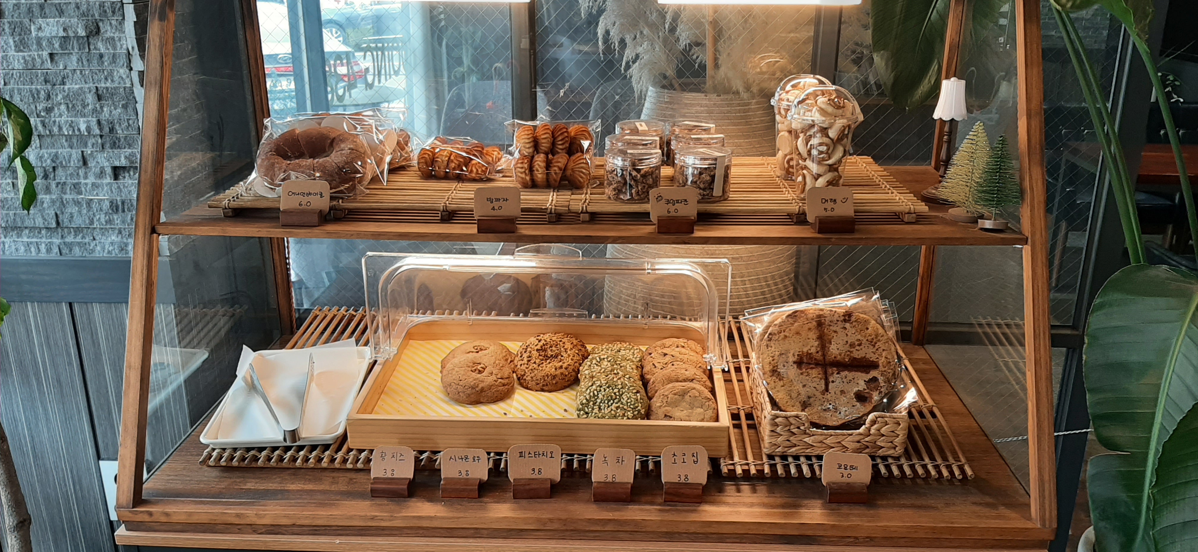 모두 맛나게 먹고, 기분 좋게 나왔는데, 딸이 태화산 명가 바로 옆에 있는 쿠잉 438이라는 카페에 들어가서 나도 따라 들어가니, 분위기도 좋고 빵도 맛있어 보여서 밤과자 2봉지와 쿠키 3종류를 구입했다.