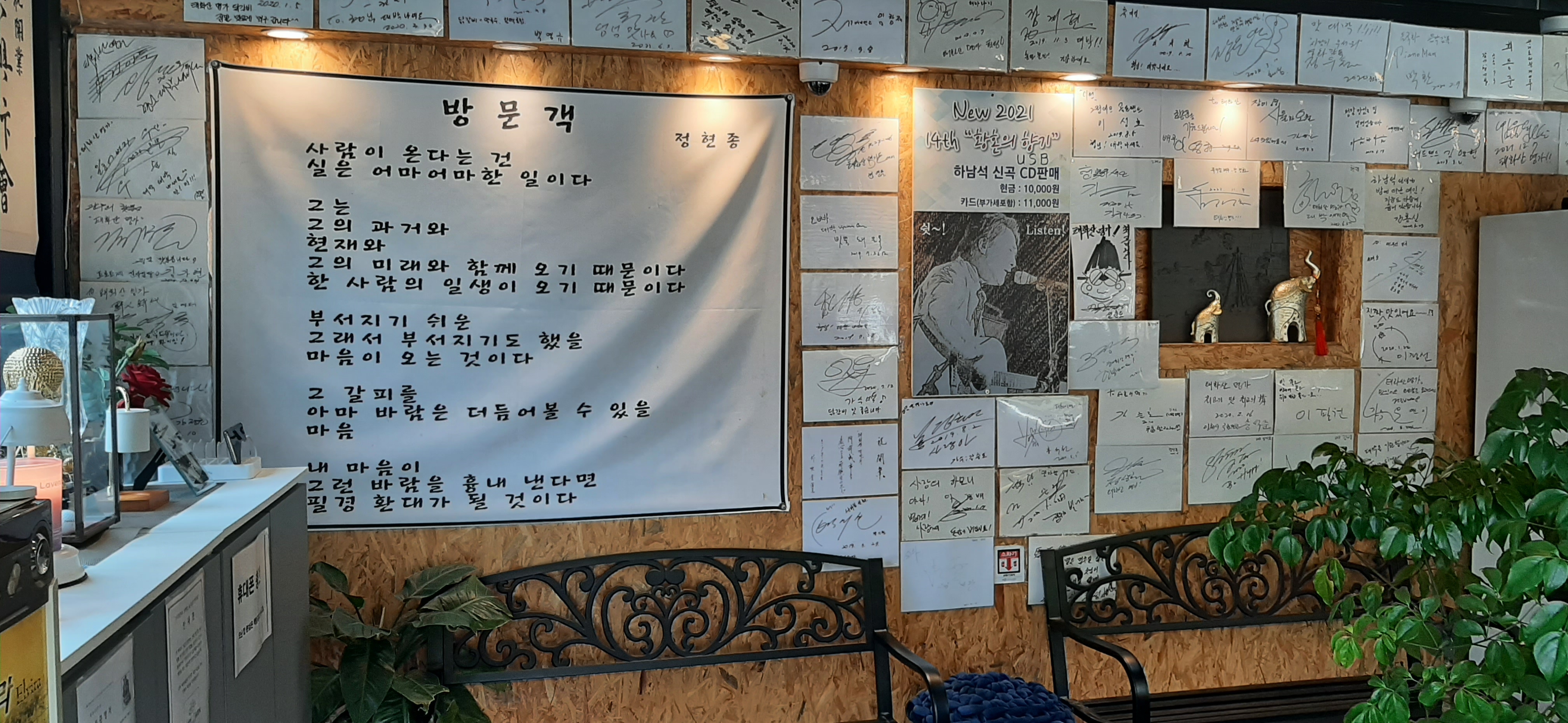 가게에 들어가면, 가게 주인인 가수 하남석 님께서 노래하는 사진과 방문객들의 사인이 많이 있다. 가수 하남석 님은 내가 젊은 시절에 아주 유명한 가수이다. 지금도 활동을 하신다. 내가 영수증에 나온 이름과 다르다고 하니, 영수증이 본명이고 하남석은 예명이라고 하신다. 내가 젊어서 좋아하던 가수를 만나니 기분이 좋고, 가수 하남석님의 히트 송 밤에 떠난 여인을 낮은 소리로 불러본다.