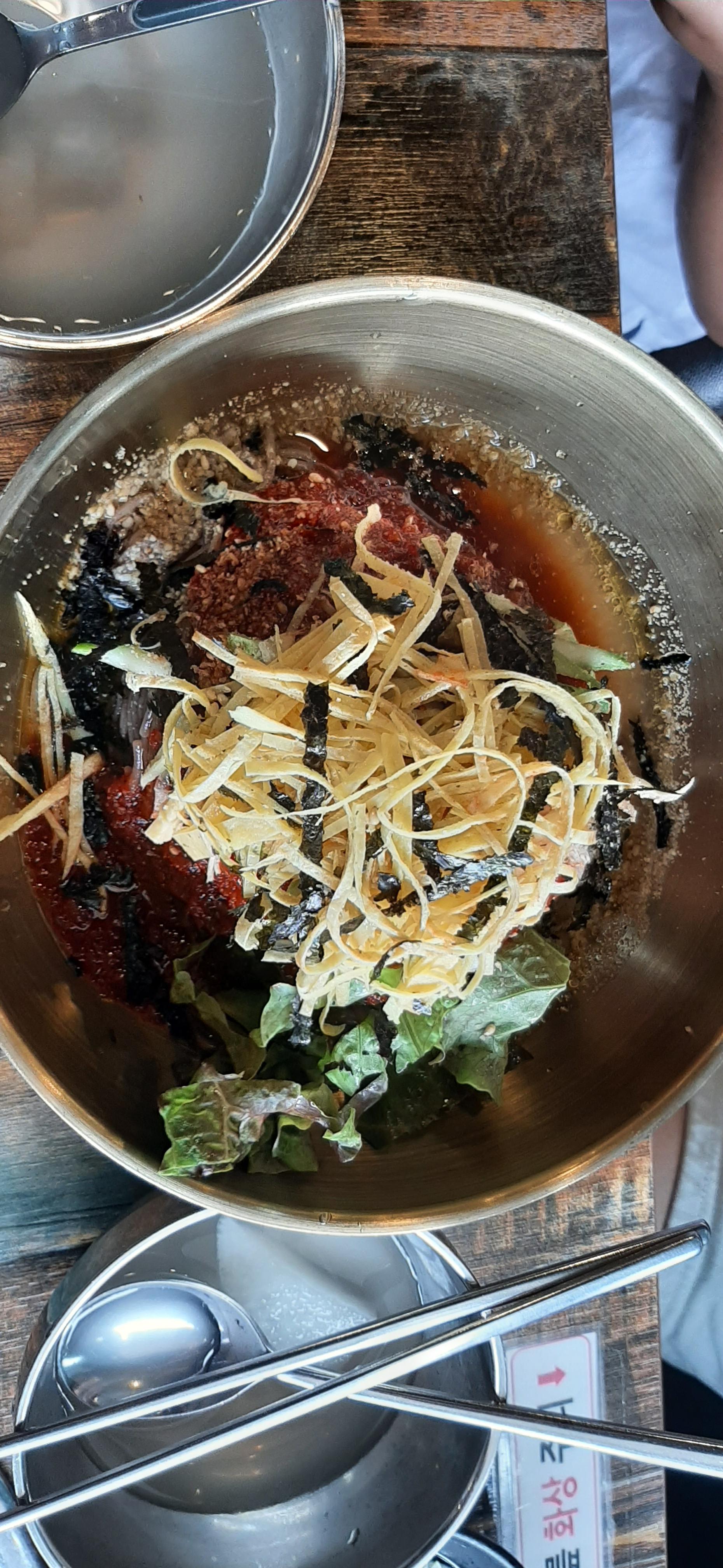 음식은 맛으로 먹고, 분위기로 먹는다. 반찬으로 상추, 양파 절임, 무생채, 동치미 등이 나오는데 나는 무생채와 상추를 많이 먹었다. 마무리로 메밀막국수 곱빼기와 음료수 2병을 주문한다.