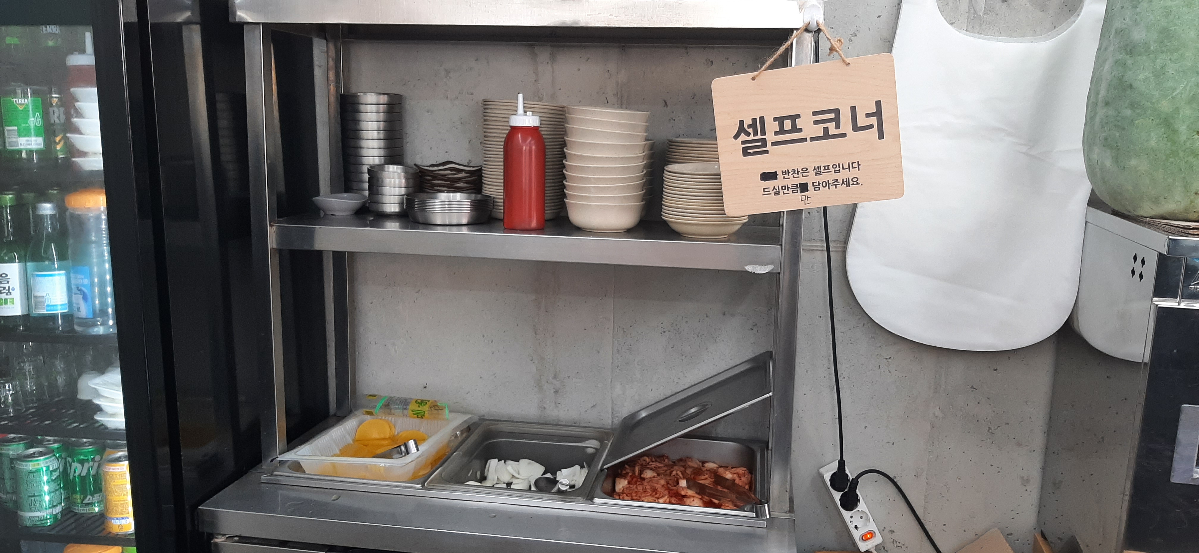 용두리 짬뽕 전문점은 유명한 맛집이라 주말에는 줄을 설 정도로 손님이 많고, 오늘은 평일임에도 가게 안은 손님들이 많다. 가게에 들어서면 종업원이 바로 주문을 받아서 포스 단말기로 주문을 하는 시스템이다. 물과 단무지, 양파, 춘장, 김치는 셀프코너에서 각자 가져와야 한다.