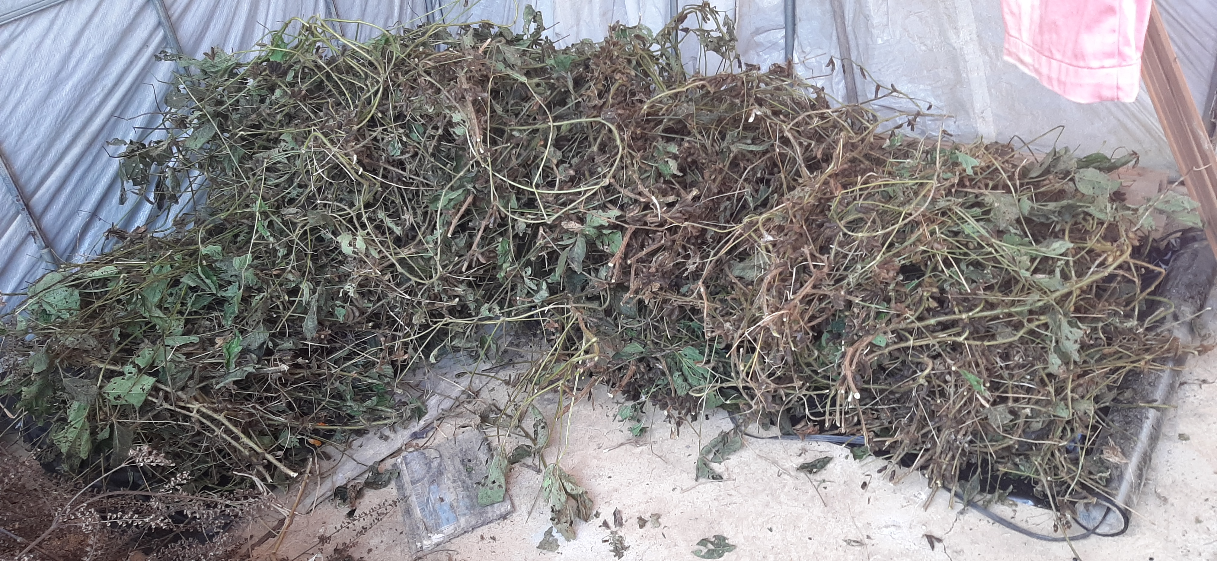 쥐눈이콩이 아주 많이 달렸다. 토마토가 아직 달리는데 새벽에 얼었다, 낮에 녹으니 물러서 못 먹는다. 낫으로 쥐눈이콩을 베어서 창고로 들이는데, 햇볕이 강해서 땀이 난다.