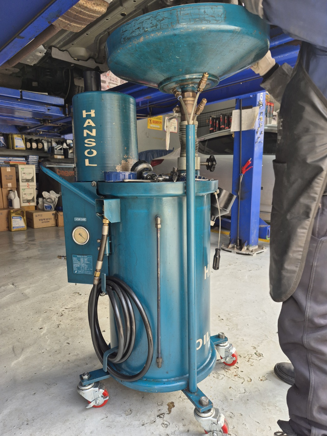 리프트로 차를 올리고, 폐 엔진오일을 수거하는 장치를