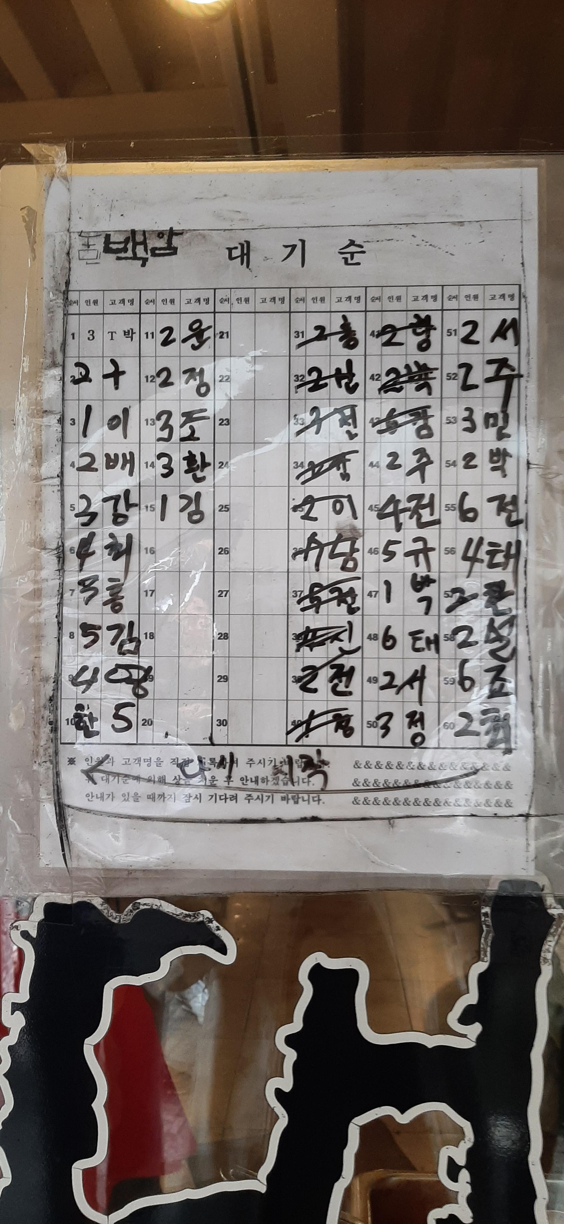 농민백암순대 시청직영점 입구에 대기 순서를 적는 판이 있어서, 인원수와 나를 알 수 있는 한 글자를 적고, 나를 호출하기를 기다린다. 대기 번호는 45번이다.