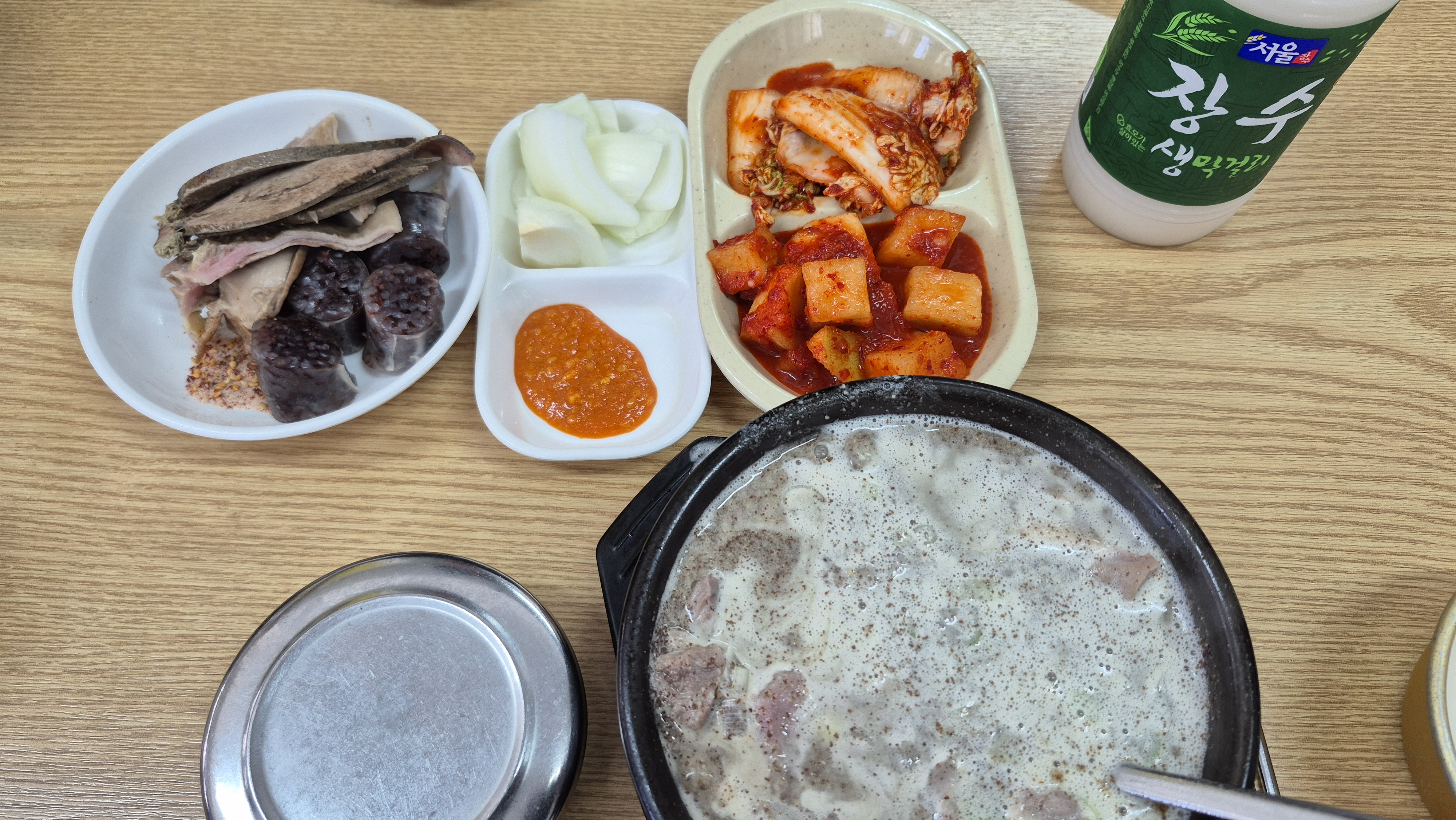 우리는 10번 주걱을 들고 7분 정도 기다리니, 자리가 있다고 들어오라고 하여 자리에 앉아서 순댓국 2개와 서울막걸리 1병을 주문한다. 강북의 좀 변두리에서 순댓국 1그릇에 11,000원을 받아서 나는 좀 비싸다는 생각을 했다. 그런데 잠시 후 반전이 일어난다. 테이블에는 새우젓, 빨간 양념, 김치, 깍두기가 있다.