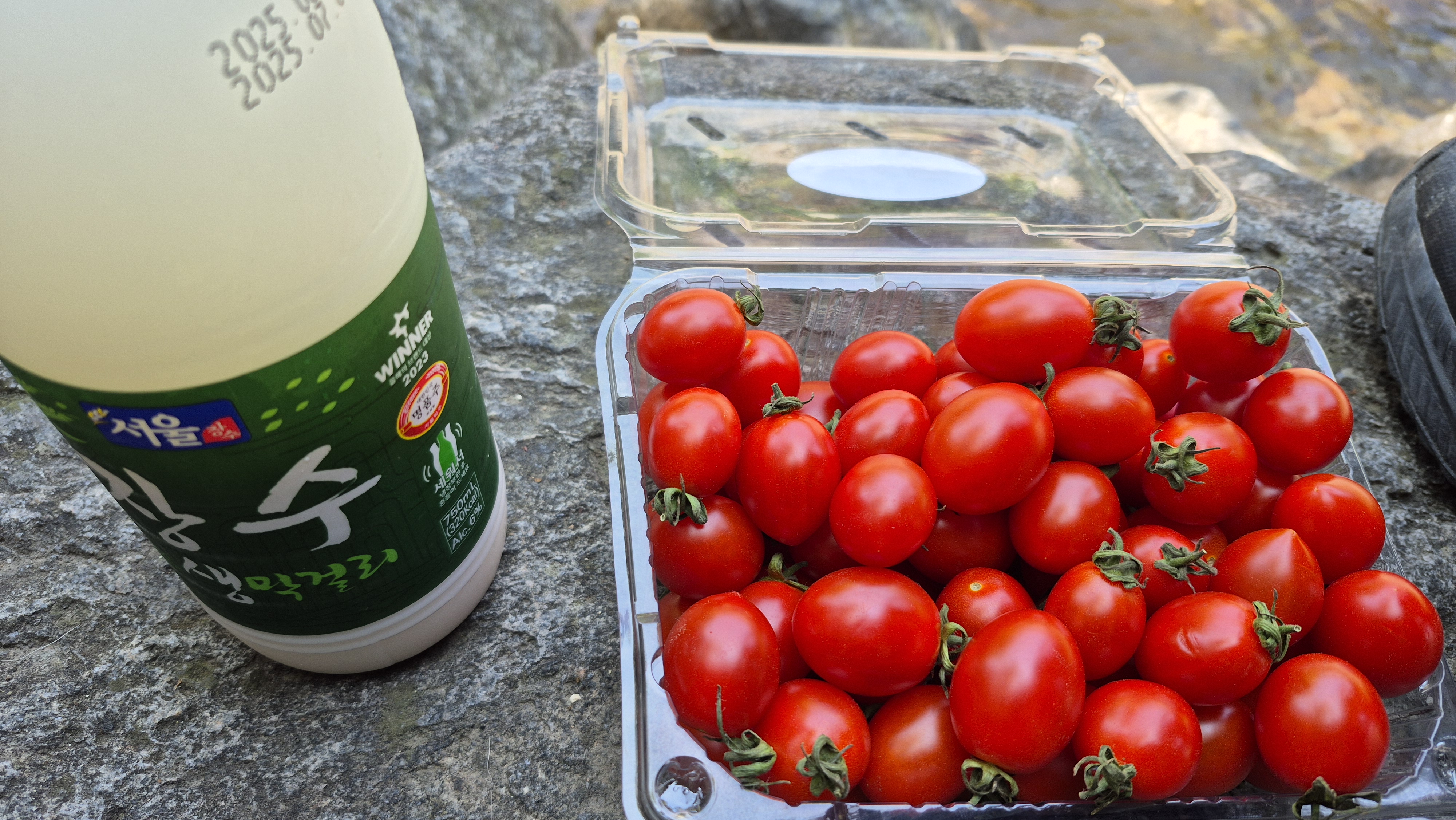 우리도 계곡에 내려가기 편한 곳에 자리를 잡고 앉아서 판을 펼친다. 아까 구입한 대추방울토마토, 집에서 가져온 과자, 편의점에서 구입한 막걸리를 꺼내니, 한상이 만들어진다.