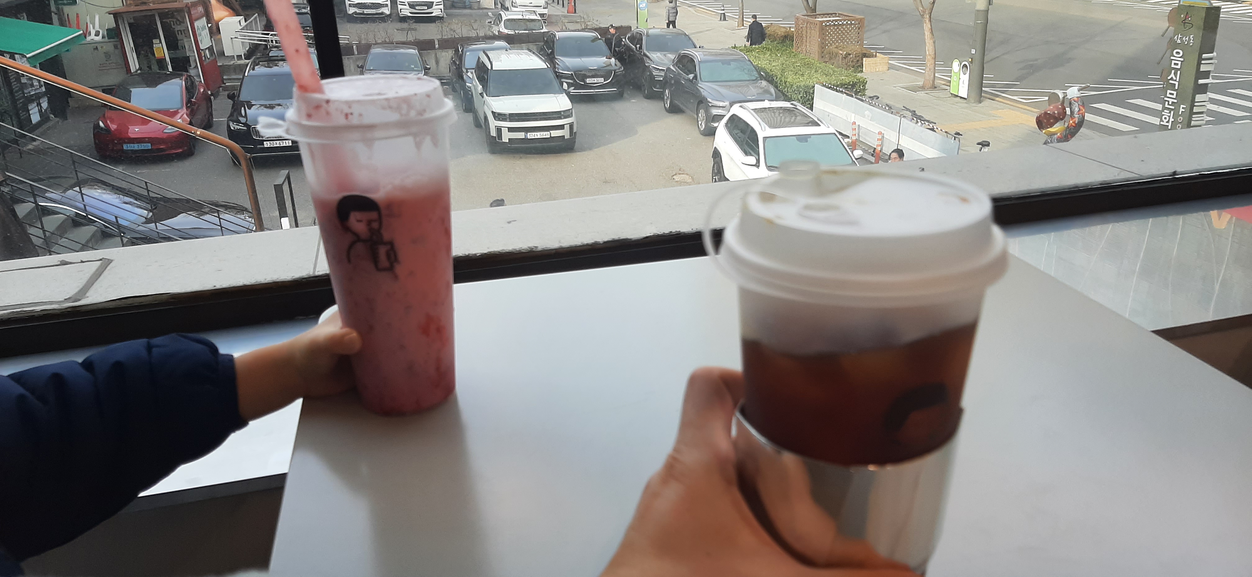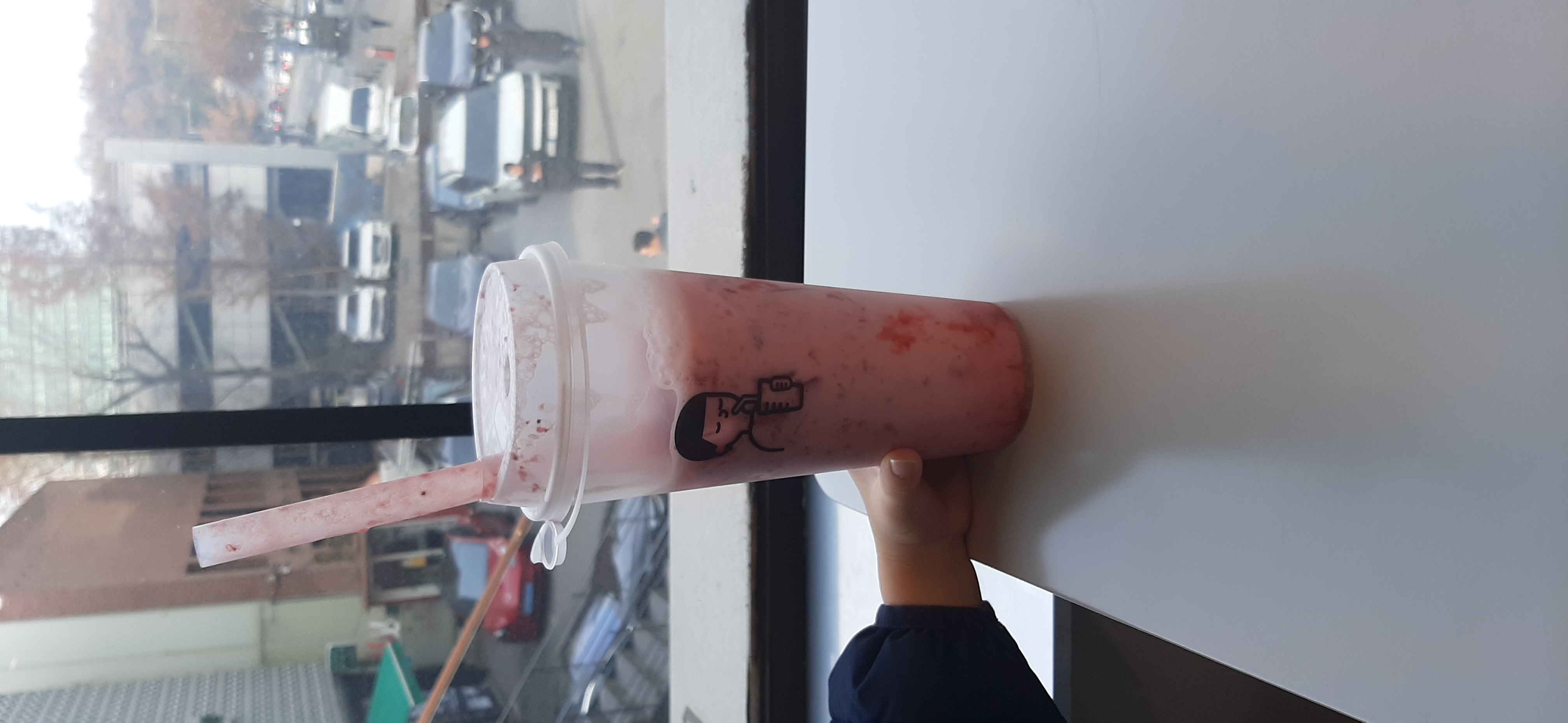 2층에 올라가서 창가에 있는 테이블에 앉아서 커피를 마신다. 아주 큰 컵에 가득 들은 딸기 주스를 손주가 빨아먹으면서, 나에게도 먹어보라고 권한다. 귀여운 아이다.