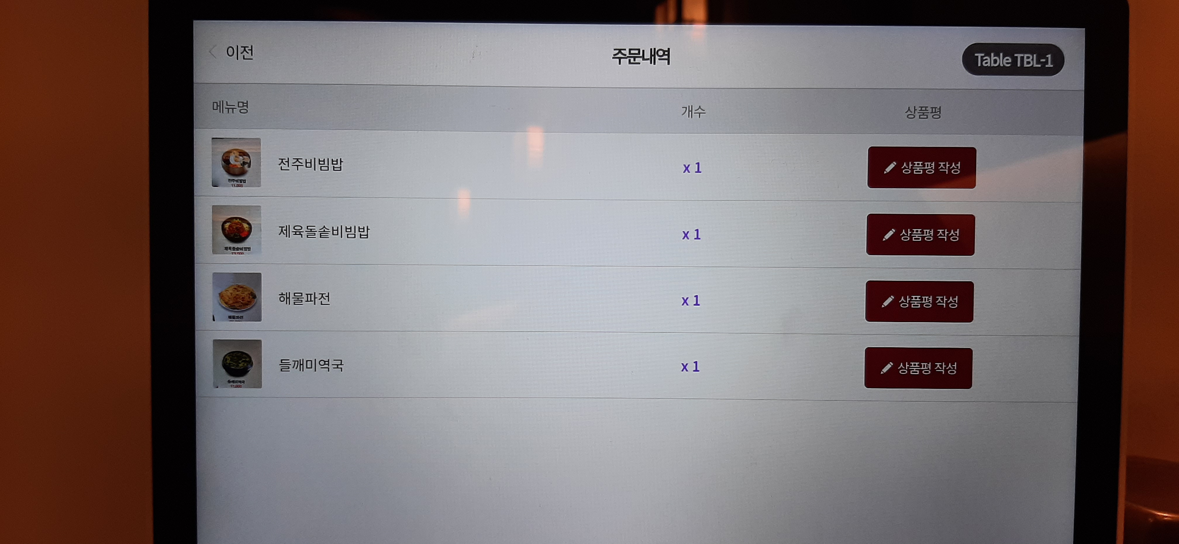 깔끔하게 리모델링을 한 식당이라 보기는 좋지만, 맛집의 오래된 느낌이 없어서 좀 섭섭하다. 테이블에 설치된 키오스크에서 딸이 주문을 한다. 전주비빔밥, 들깨미역국, 제육돌솥비빔밥, 해물파전을 주문한다. 여러 가지를 주문하여 맛을 보려고 한다.