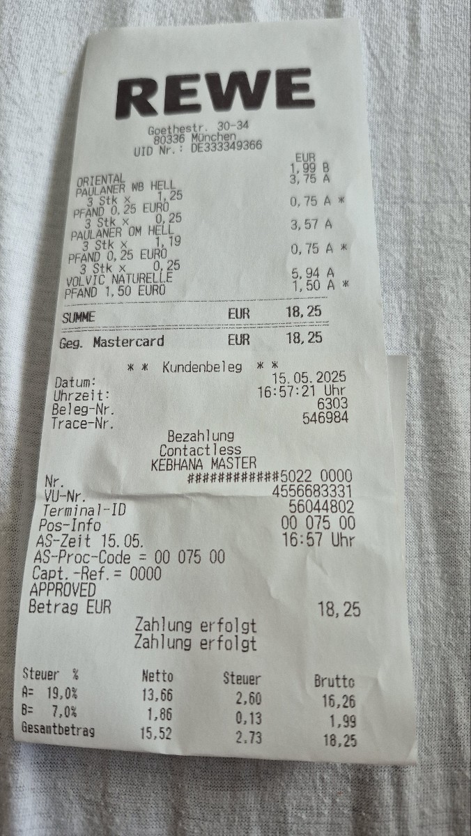 REWE에서 구입한 물건의 가격이 내 생각보다 더 많이 나온 것 같아서, 숙소에 와서 영수증을 자세히 살펴보니 PFAND라는 말과 맥주 1캔에 0.25유로를 더 청구했다는 것을 알았다. 생수도 6병에 1.5유로를 더 청구해서 총 3유로를 더 청구한 것이다. PFAND는 보증금 반환 시스템으로 재활용을 위하여 용기를 가져오면 1병에 0.25유로를 환불해 준다는 의미이다.