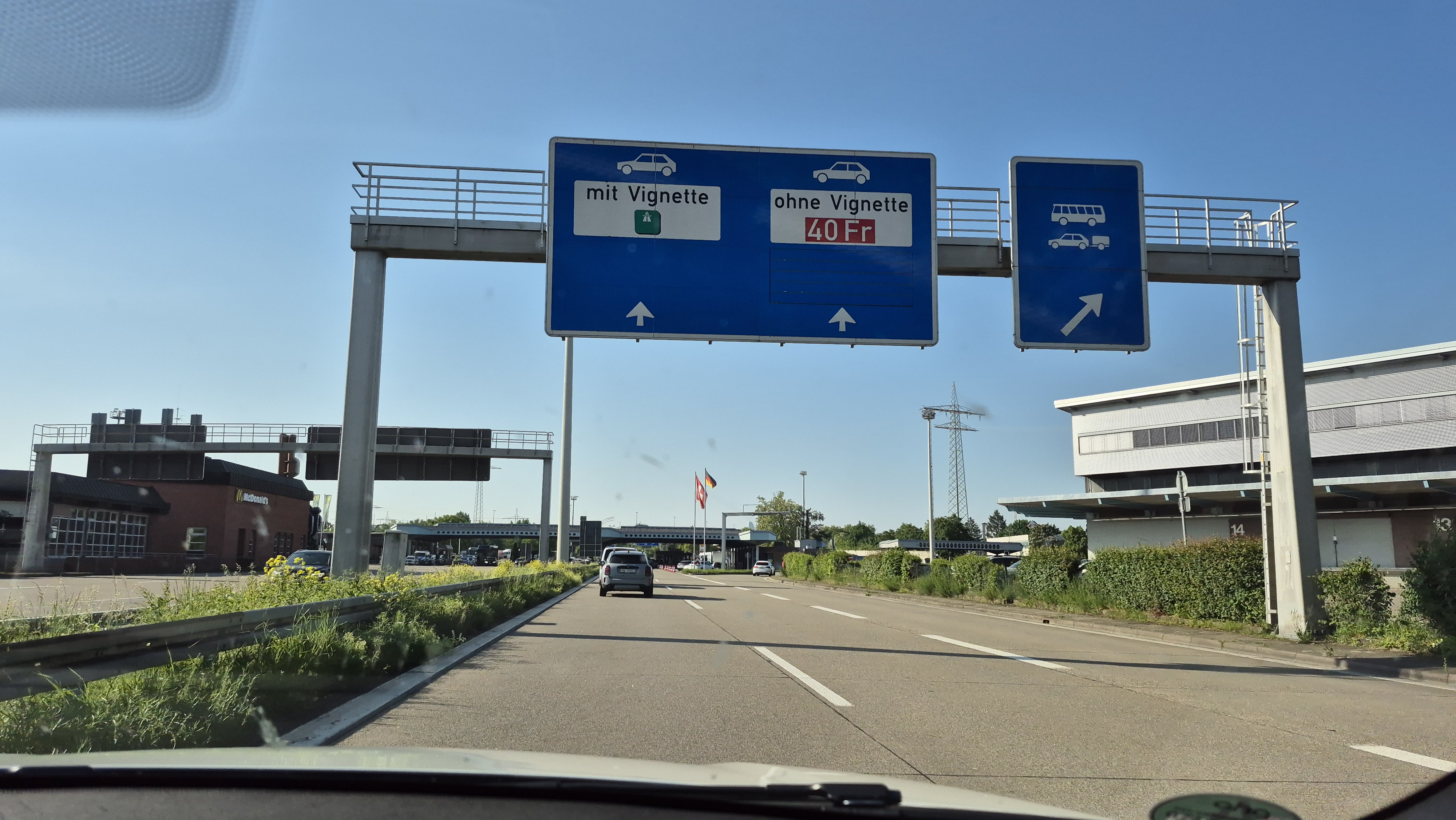 스위스는 유럽연합 회원국이 아니라 스위스 화폐를 사용하고, 독일과 스위스의 국경을 통과할 때 고속도로 통행료를 내야 한다고 한다. 국경 근처에 마트에서 통행료 티켓을 사서 차 유리에 붙여야 한다.