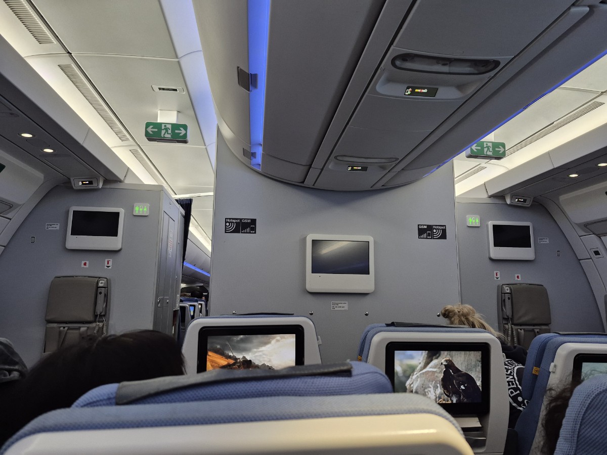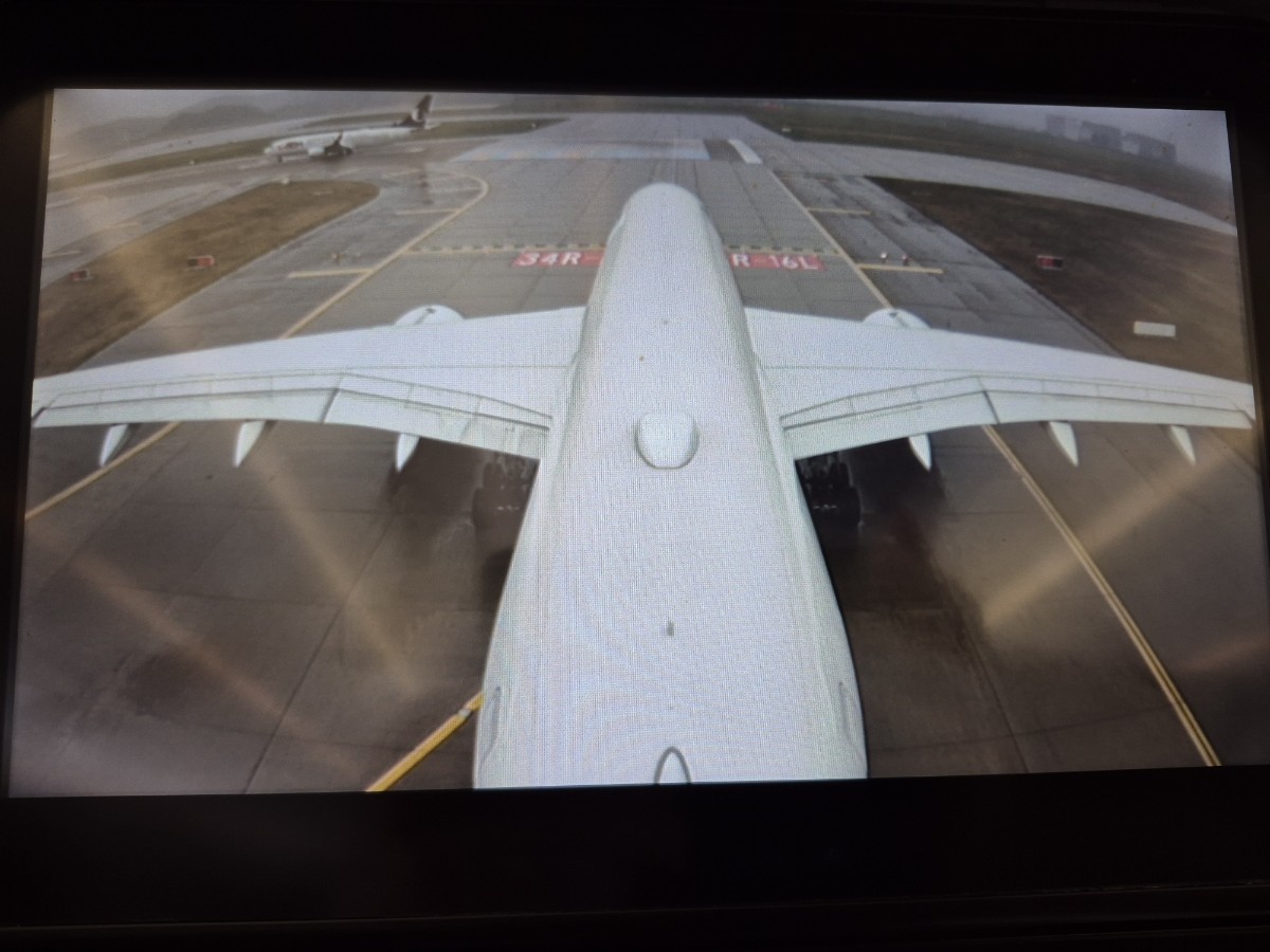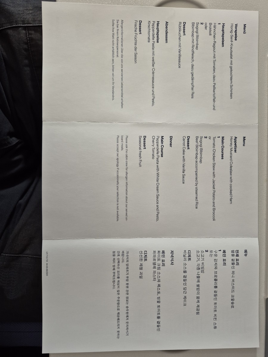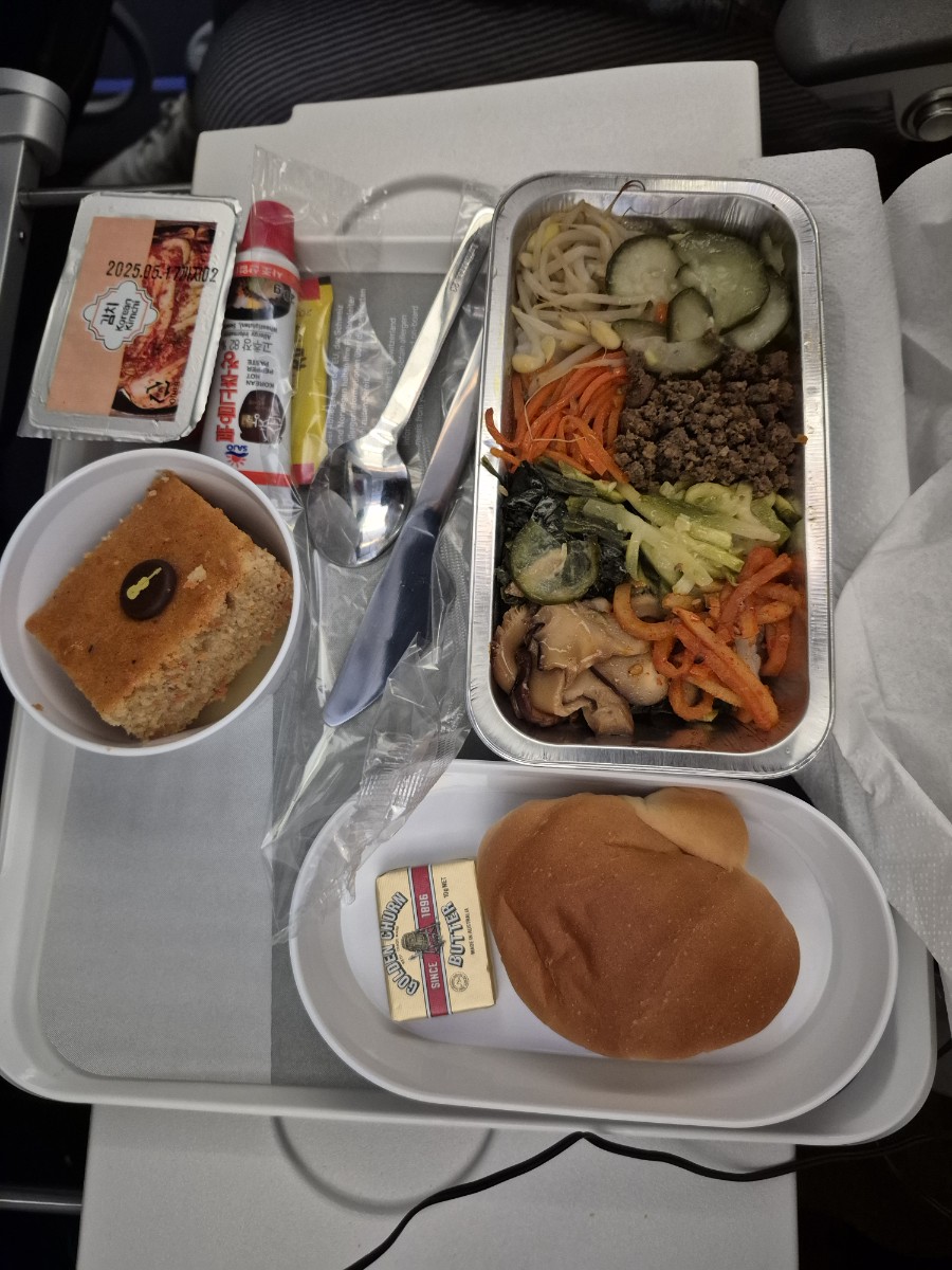 비행 중에 난기류를 만나서 비행기가 많이 흔들리고, 기내 모든 서비스가 중단된다. 배고프다. 13시 48분에 스튜어디스들이 서비스를 시작한다.