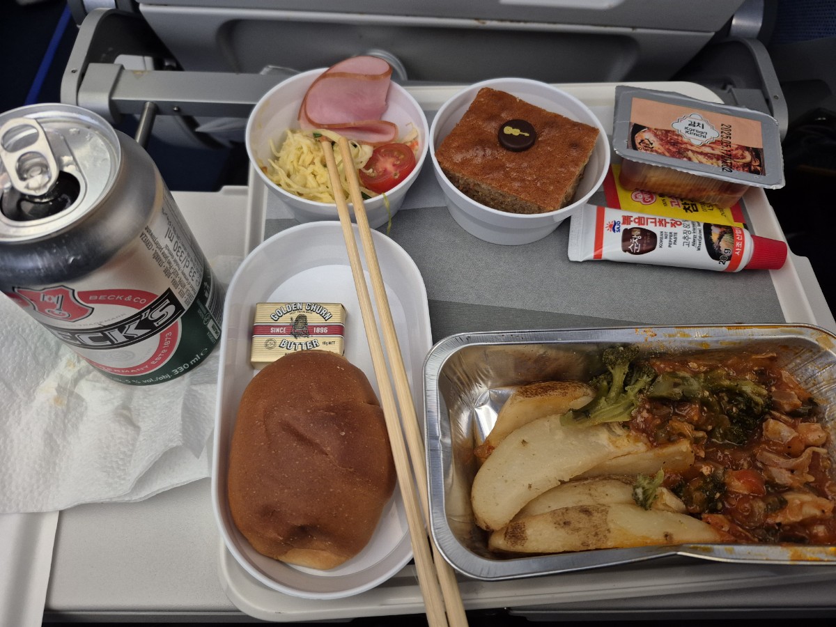 배고픈데 내 차례는 언제 오려나. 저 멀리서 서비스를 한다. 밥을 준다고 생각했는데 음료수를 가져온다. 나는 독일 맥주를 달라고 한다. 벡스라는 독일 맥주와 과자봉지를 준다. 시원한 벡스 맥주를 한 잔 마시니 기분이 좋다.