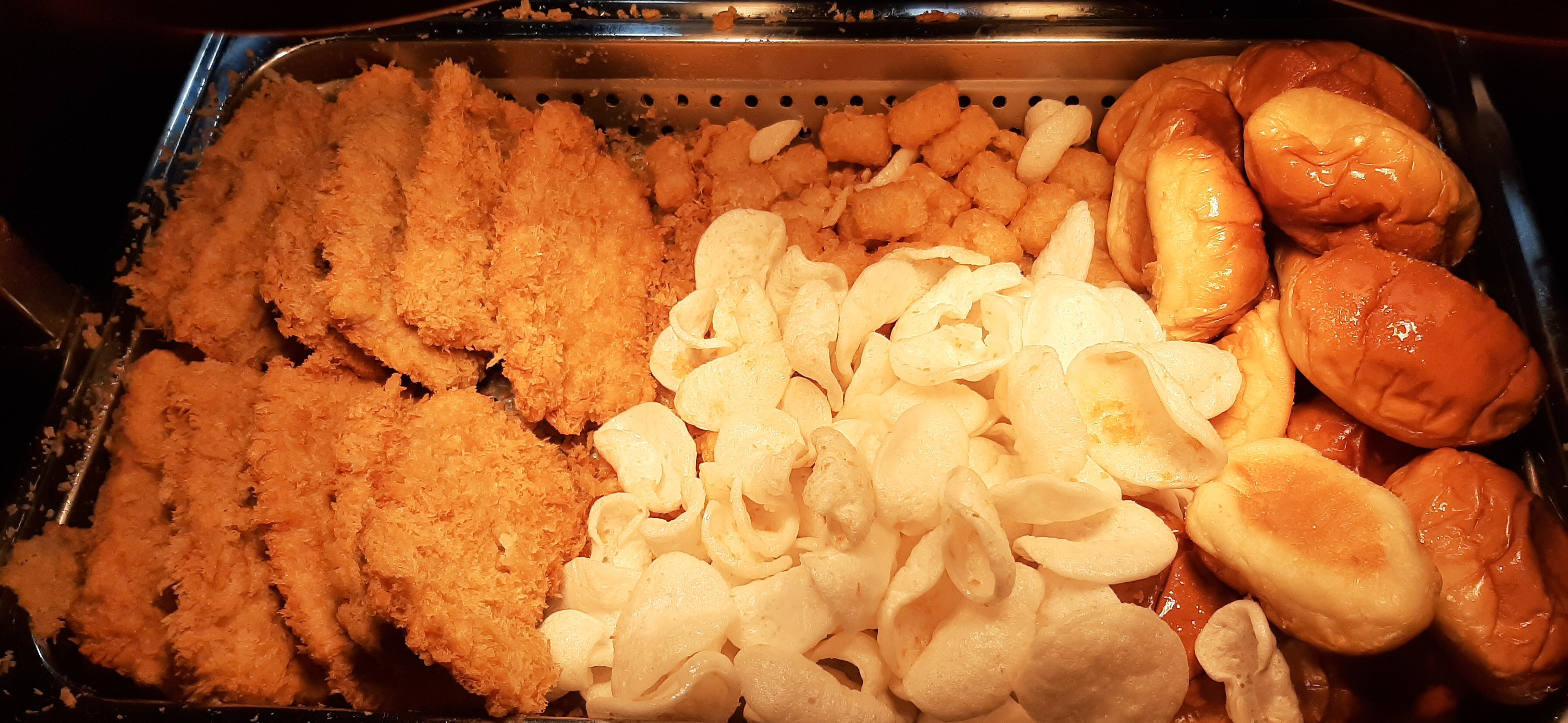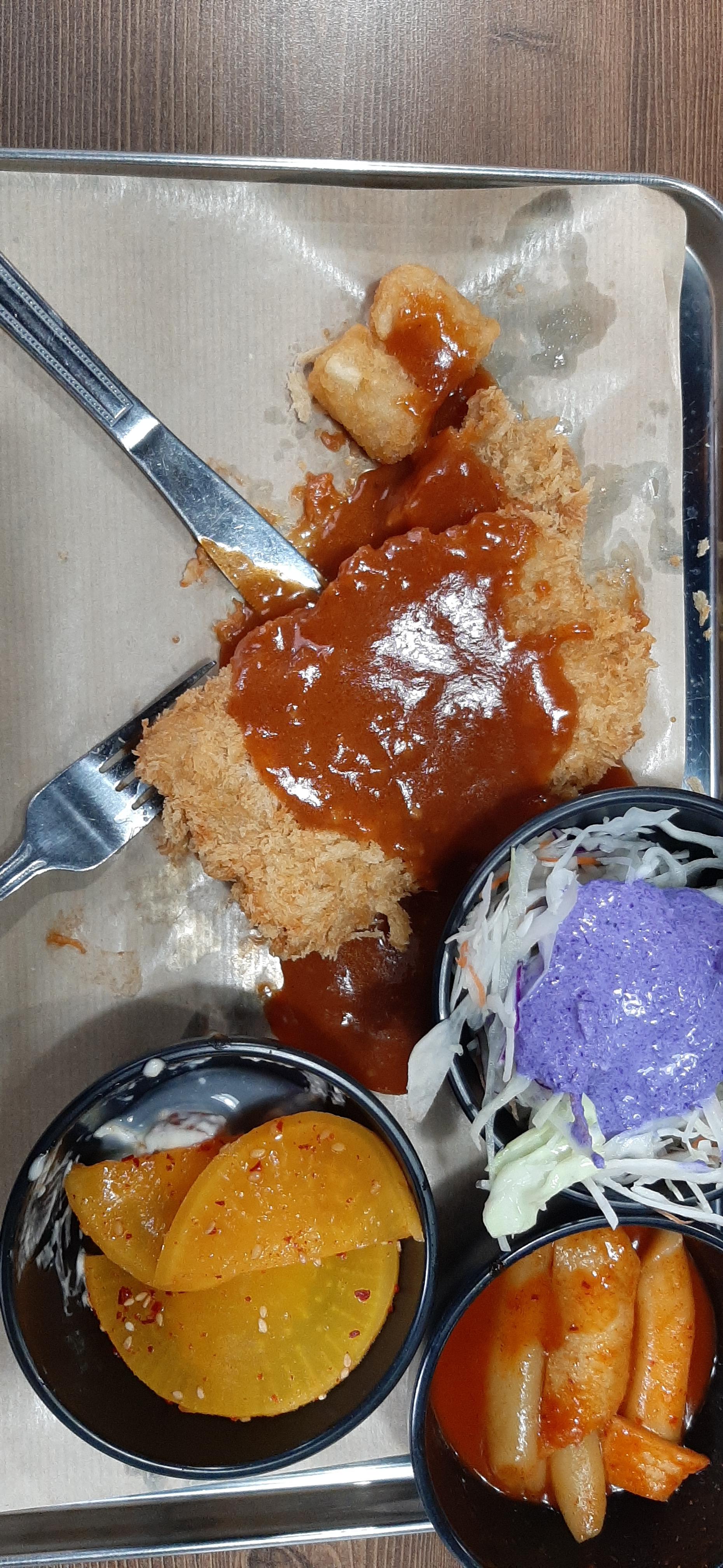 배식대에서 식판과 포크, 나이프를 챙기고, 돈가스 1개를 담고, 고추장 국물 떡볶이 3개와 국물을 담고, 양배추 샐러드, 단무지 무침을 담아서, 자리를 잡고 앉아서 천천히 먹는다. 돈가스는 잘 튀겨져서 바삭하고, 떡볶이 국물이 국물을 좋아하는 내 입에 딱 맞는다. 잡채와 제육볶음도 맛있어 보이는데 배가 불러서 나는 안 먹었다. 돈가스 소스는 매운 소스와 과일소스 두 종류가 있다.