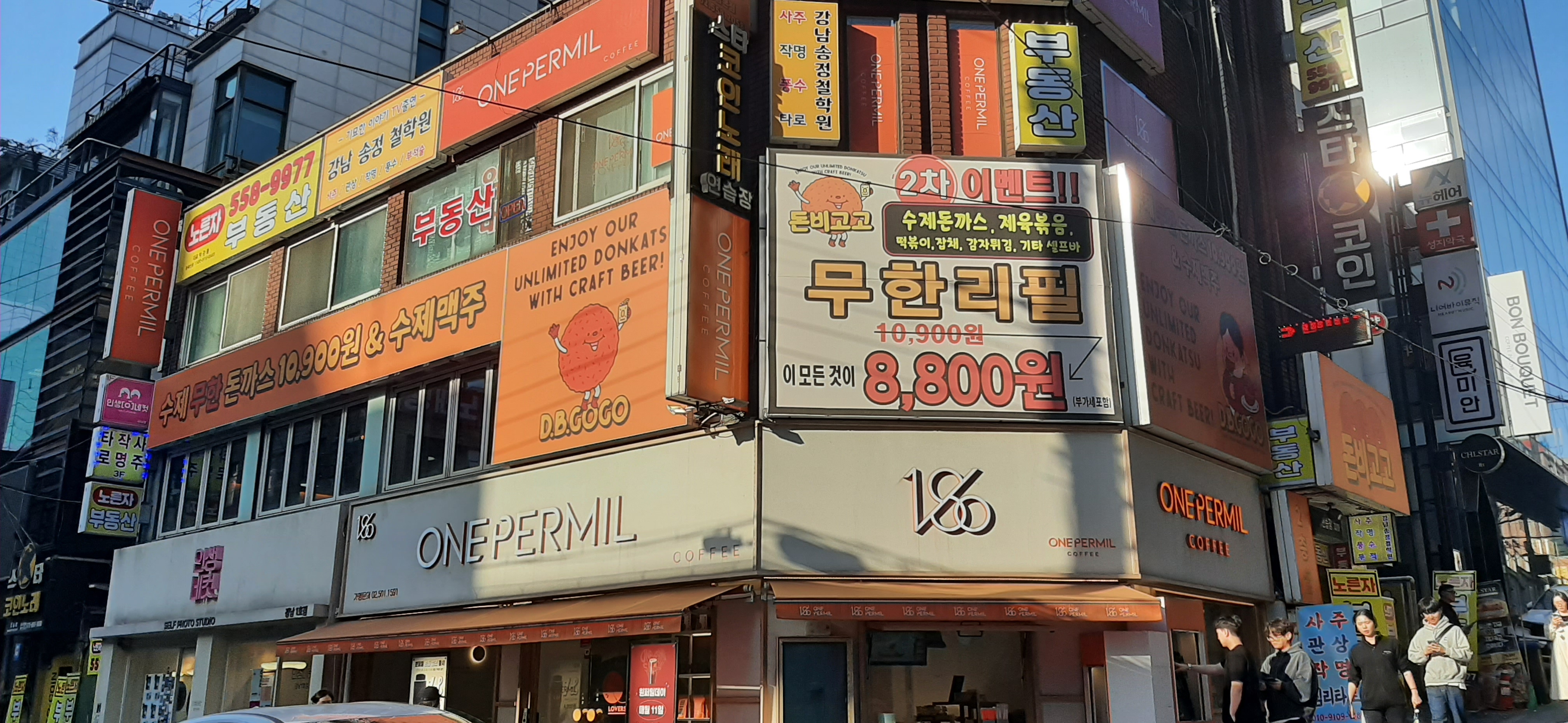 9호선 전철을 타고 신논현 역 6번 출구로 나가서 잠시 걷다가 우회전을 하니 골목 4거리 코너 2층에 돈비고고가 보여서 블로그에 올릴 자료사진을 찍고 2층으로 올라가서, 가게로 들어가니 키오스크가 있어서 1인 8,800원 결제를 했다.