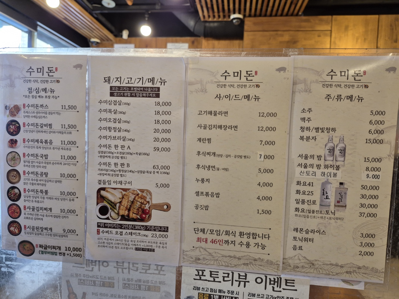 수미돈은 4시 30분에 오후 영업을 시작하는데, 우리는 4시 10분에 가게에 들어갔는데, 사장님께서 흔쾌히 맞아주어서 너무 감사하다. 수미돈 한판 B(오겹)와 카스 맥주, 새로 소주를 주문했다.