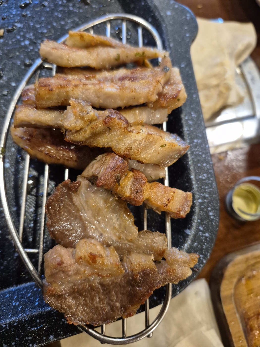 시원하게 맥주를 마시고, 새로 소주를 마신다. 돼지고기의 다양한 부위들과 버섯, 파김치를 맛나게 먹는다.