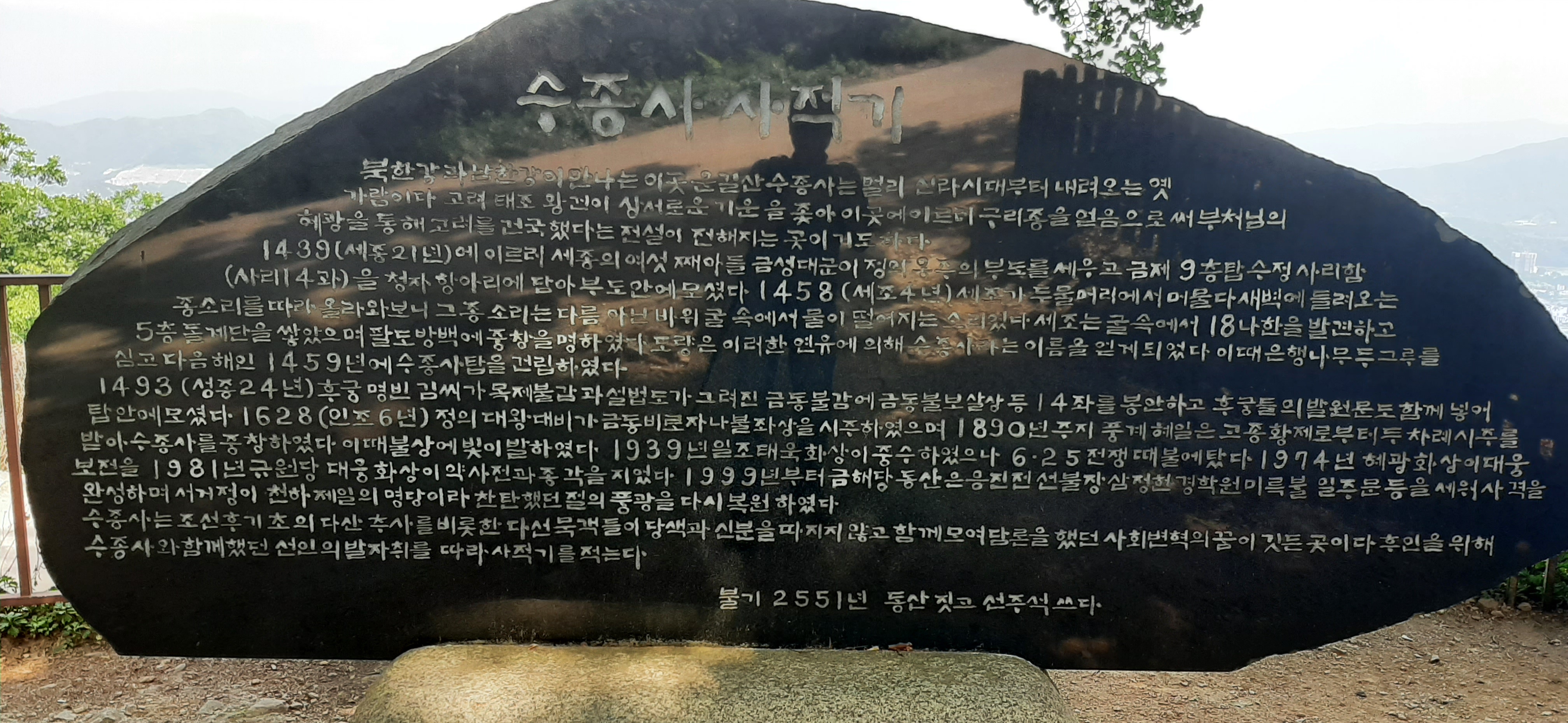 큰 절은 아니지만 입지가 좋아서 많은 사람들이 있다. 대부분 등산객이다. 절에서 보는 두물머이의 풍광이 아주 아름답다. 주변의 등산객과 서로 증거사진을 찍어준다. 나는 두물머리가 잘 보이는 곳에 자리 잡고 찍었다. 세조를 감동시킨 종소리의 유래가 적힌 글도 있다. 오래된 은행나무 앞에서 사진을 찍었다. 시간이 지나면 남는 것은 사진이다. 기억이 희미할 때 사진을 보면 그 당시의 상황이 잘 떠오른다.