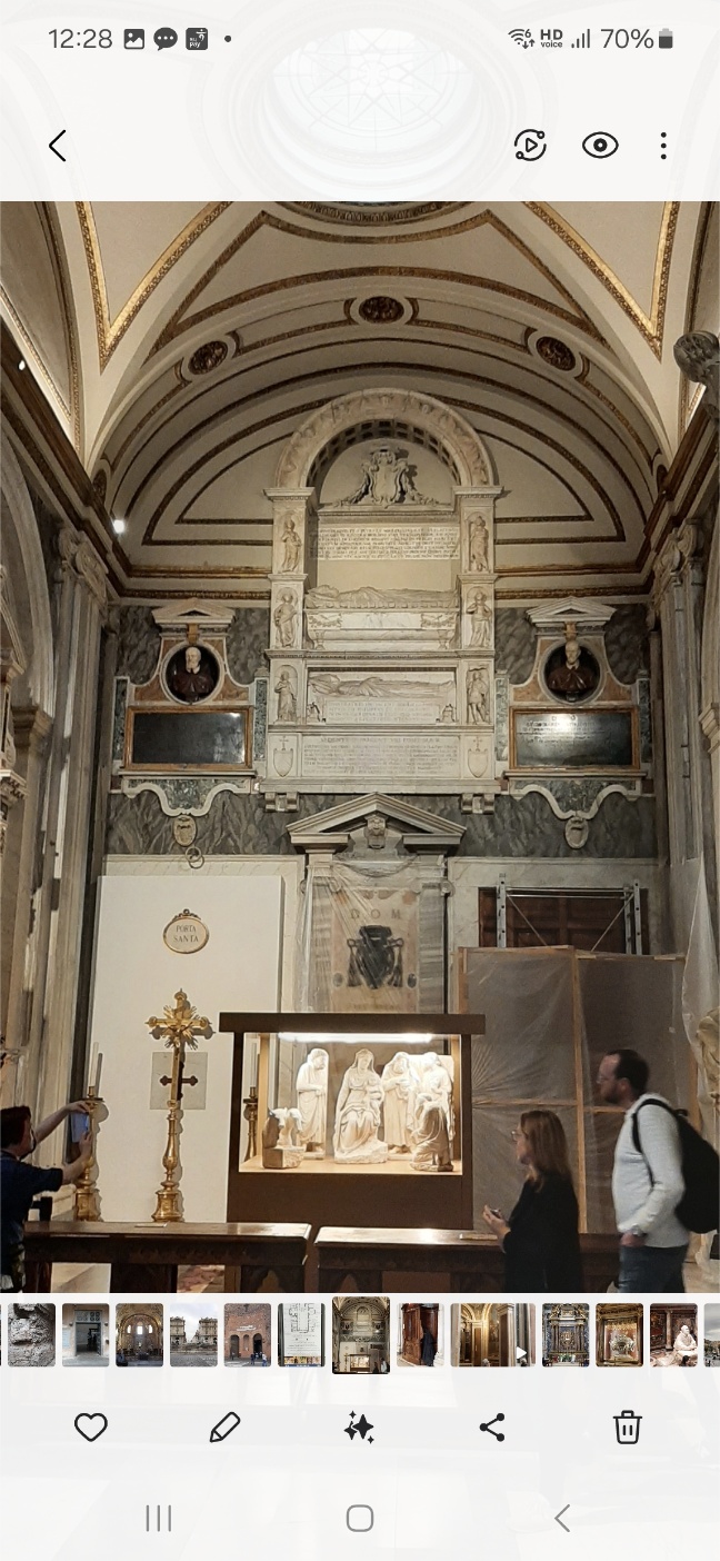 성 베드로 성당의 피에타(이탈리아 어로 슬픔, 비탄이라는 의미)는 미켈란젤로의 걸작이다. 많은 관광객들이 조금이라도 가까이에서 감상하려고 노력을 하지만 유리 안에 갇혀있는 피에타를 정확히 관람하기 어렵다. 나도 멀리서 사진을 찍었는데, 사진 찍는 것도 어려웠다.
