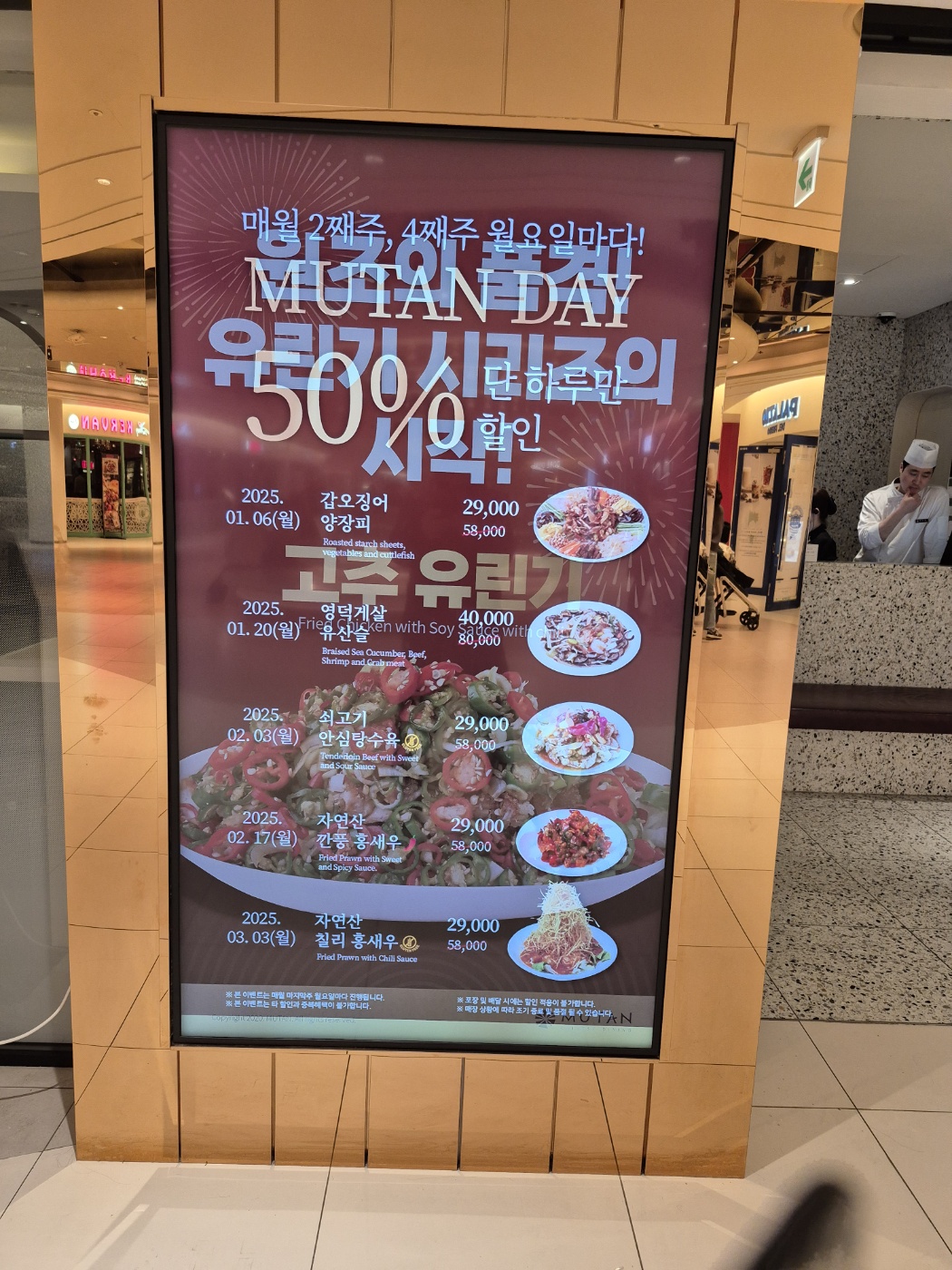 오늘은 2024년 3월 25일 월요일이다. 서울 강남구 삼성동 코엑스 지하 푸드커트에 있는 중식당 무탄에서는 매월 마지막 주 월요일을 무탄 데이라고 하며, 정해진 요리를 50% 할인해서 판매를 한다.