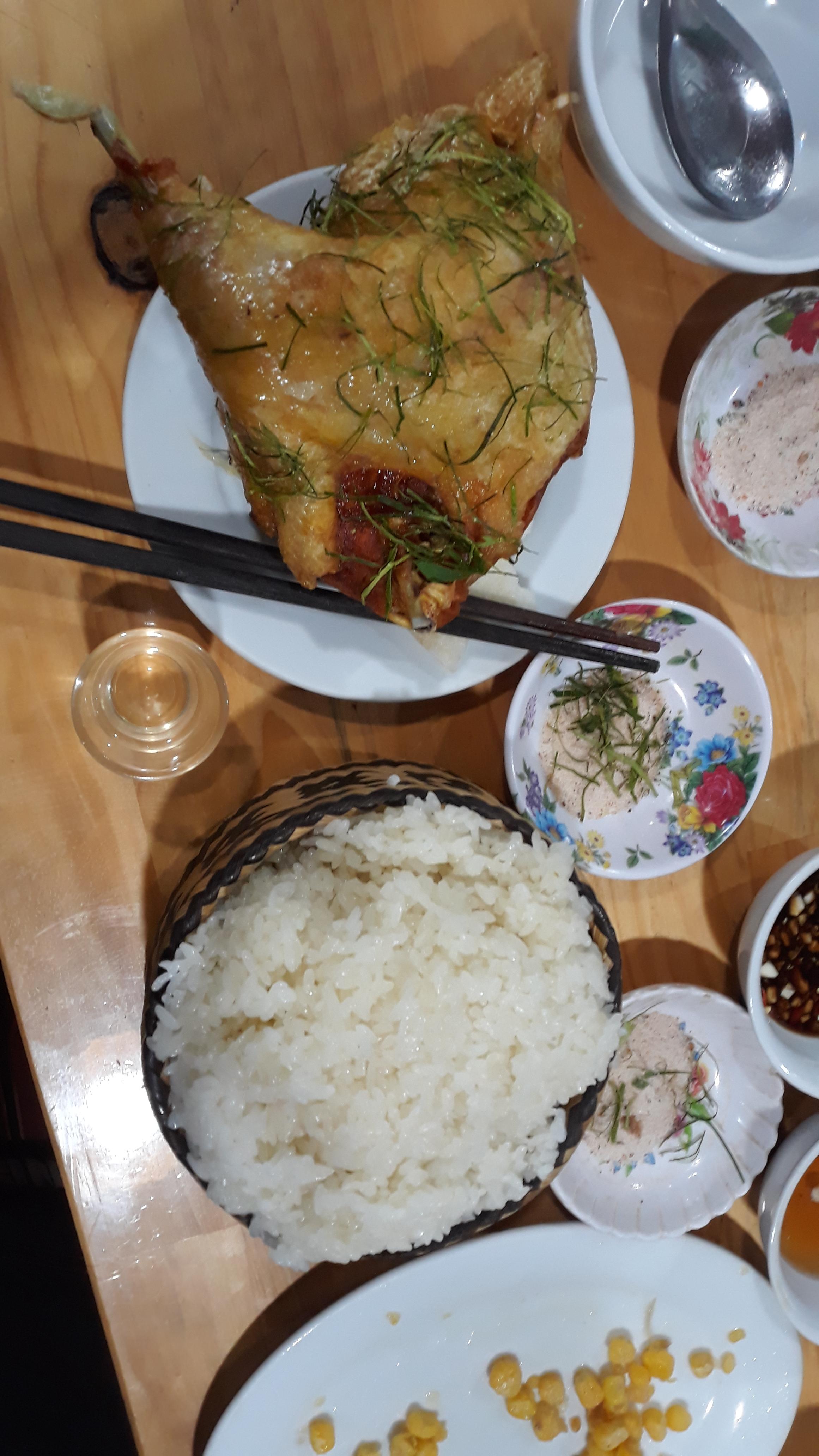 선라에 도착하여, 호텔을 나오니 맞은편에 음식점들이 있는데, 그중에 좀 큰 음식점으로 들어간다. 닭요리를 주문했다. 잠시 후에 옥수수를 살짝 튀긴 것이 나왔는데 맛있다. 처음 먹어보는 옥수수 요리이다. 우리나라 전기구이 통닭 비슷한 닭요리가 나온다. 우리나라 토종닭같이 아주 커다란 닭다리를 포함하여, 1인당 반마리가 나온다. 음식 이름은 모르고, 가격은 1인분에 110,000동(한화 5,500원)이다. 6명이 먹었으니 660,000동이다. 나와 병수는 신이 나서, 미리 준비한 베트남 전통주를 주거니 받거니 즐기면서, 가문에서 최초로 3,000미터급의 고산을 등정한 이야기를 하면서 마신다.