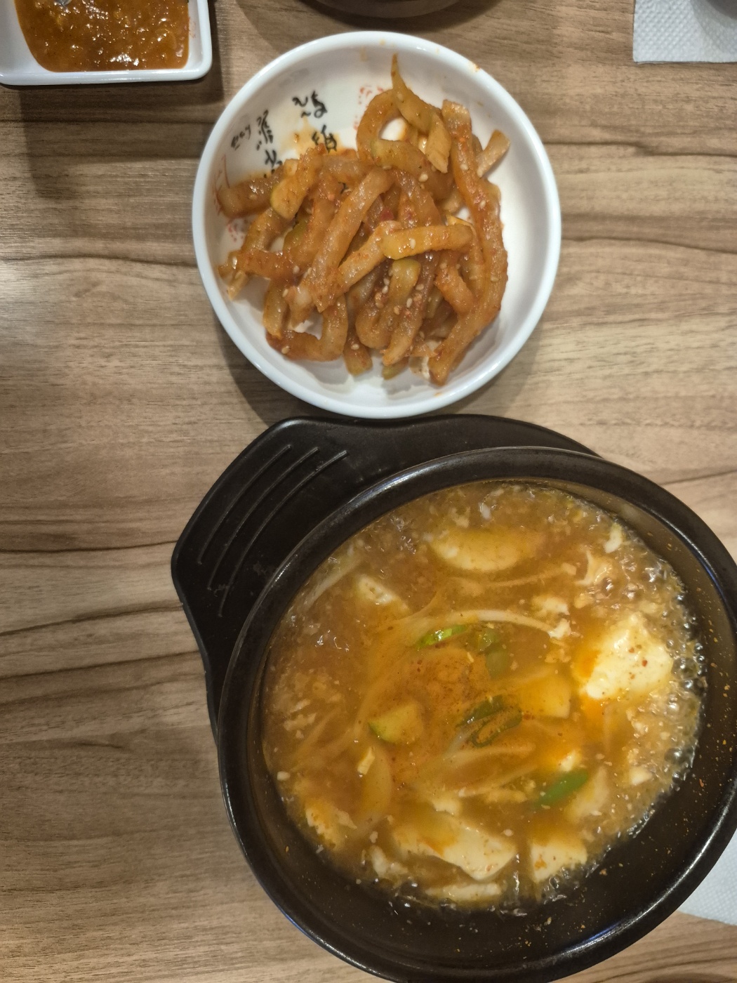 한우리 족발은 맛있는 순두부찌개를 기본으로 내어주고, 백김치와 양념한 절인 무를 기본으로 준다.