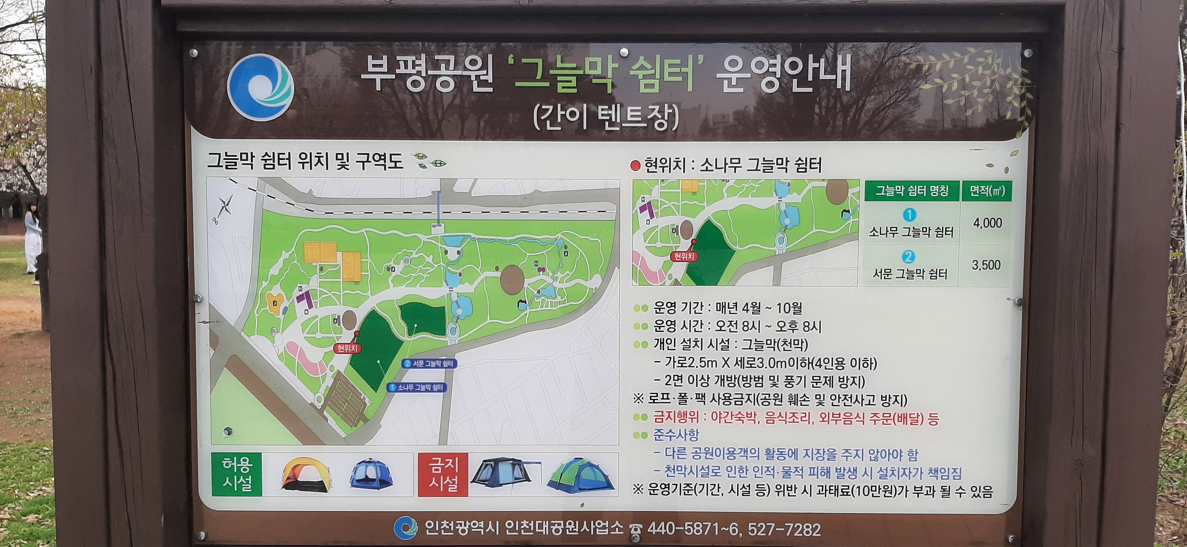 4월부터 10월까지 부평공원에 지정된 장소에 텐트를 치고 휴식을 할 수 있다. 멀리 캠핑을 안 가도 공기 좋고 조용한 공원에서 쉴 수 있다.