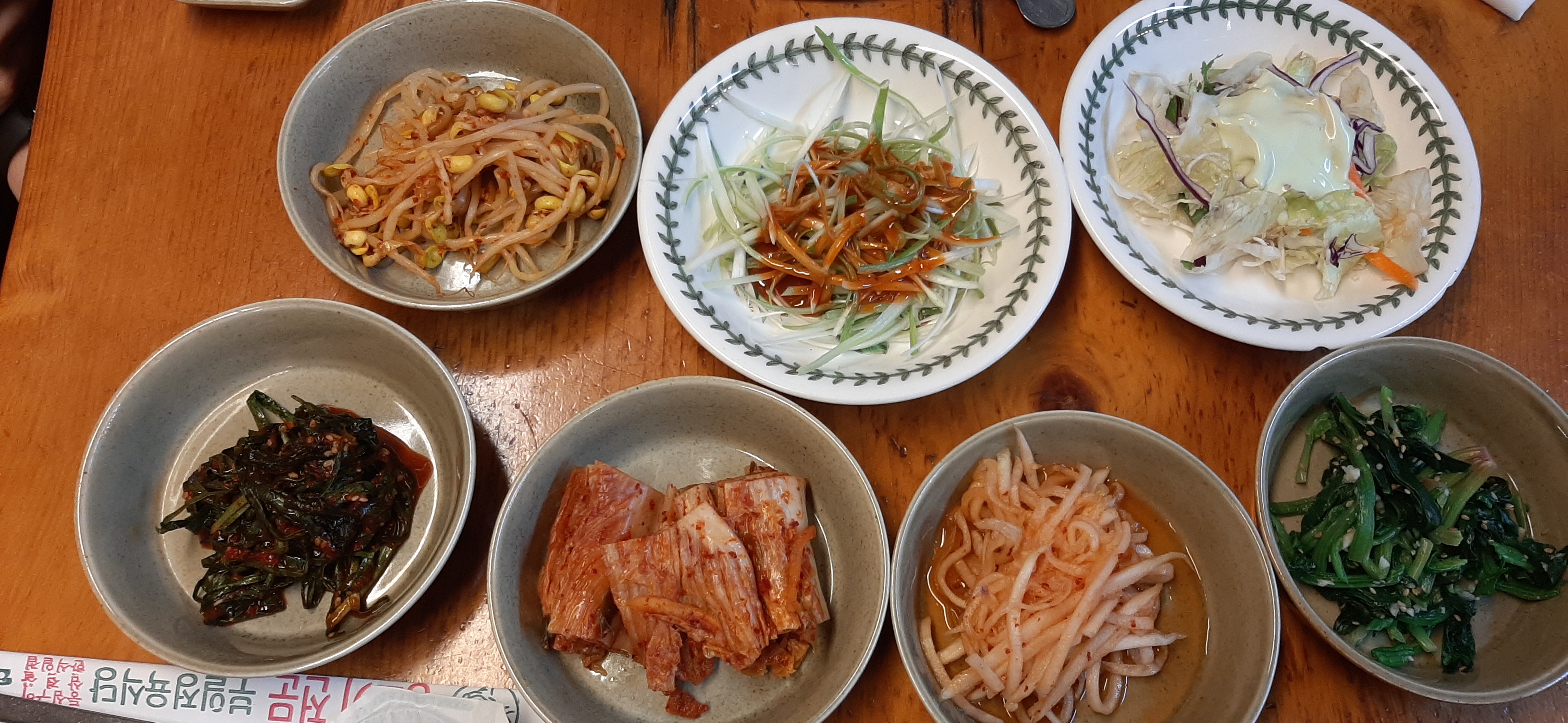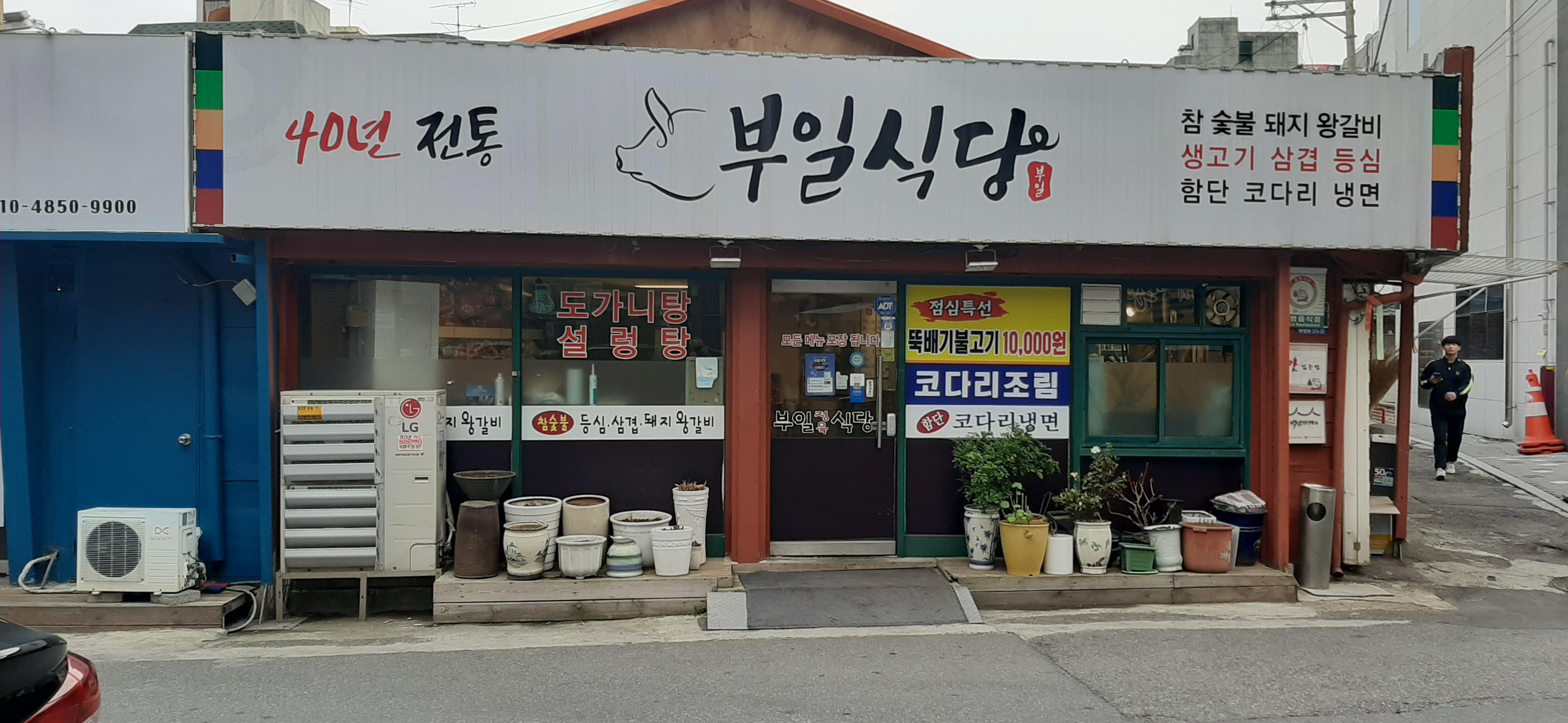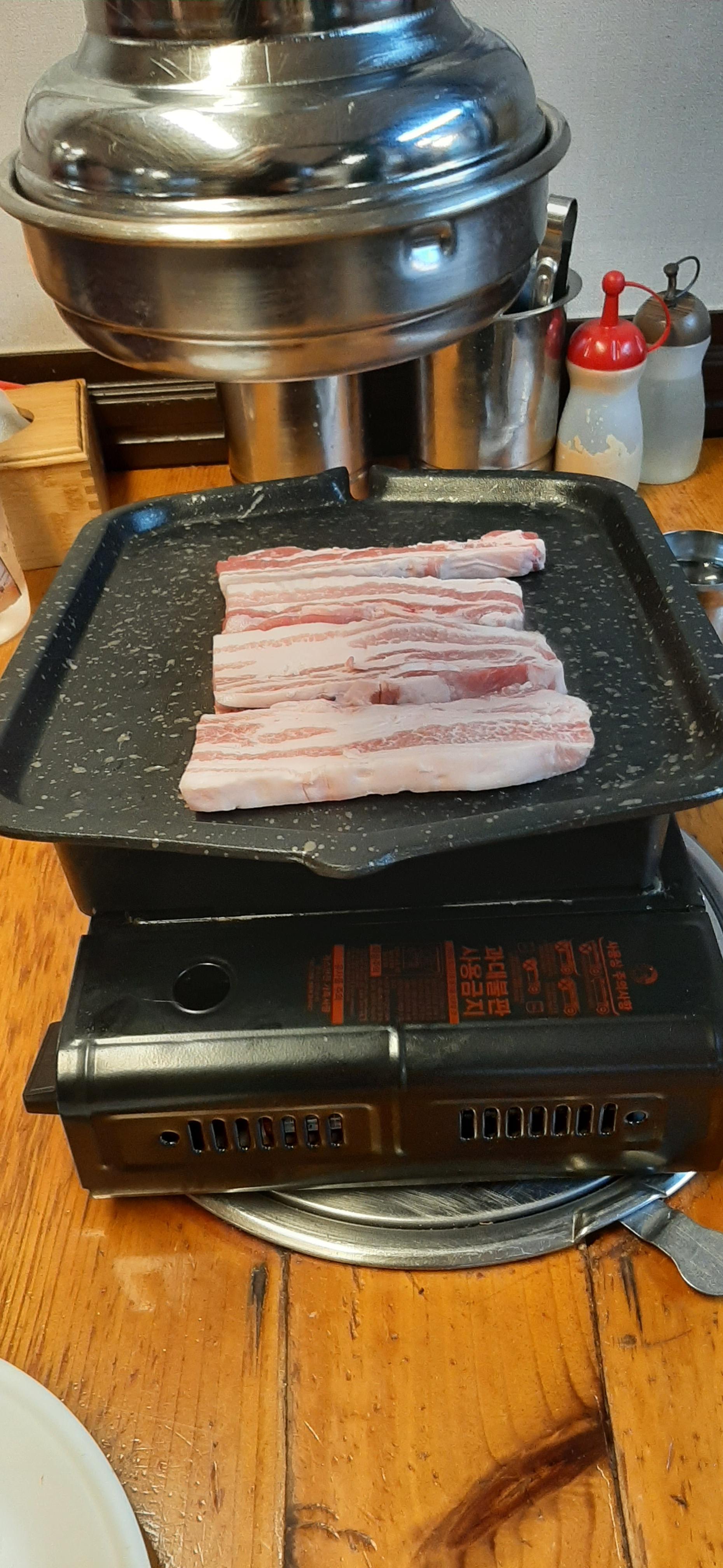 아들이 사는 집 근처에 40년 전통 부일식당으로 가서 삼겹살 2인분과 공깃밥을 주문한다. 기본 반찬이 깔리고, 삼겹살을 불판에 굽는다.