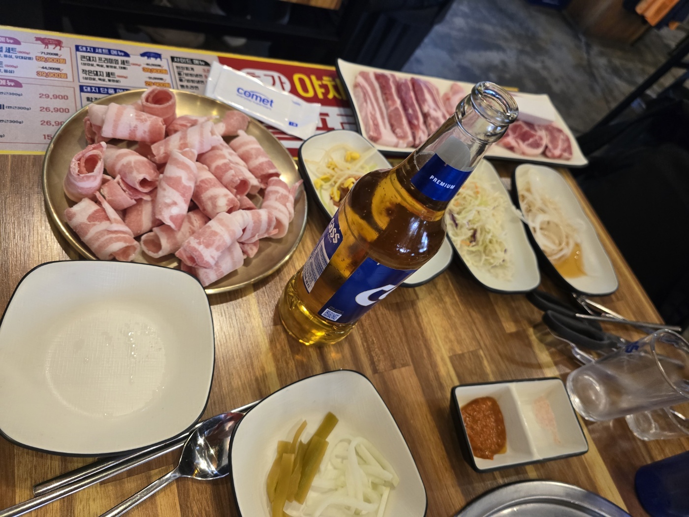 가게도 적당히 크고, 흘러나오는 음악은 7080 세대를 감동시킨다. 우리 일행은 6명이라 큰 돼지 프리미엄세트 2개를 주문하고 소주와 맥주를 가져와서 먹는다.