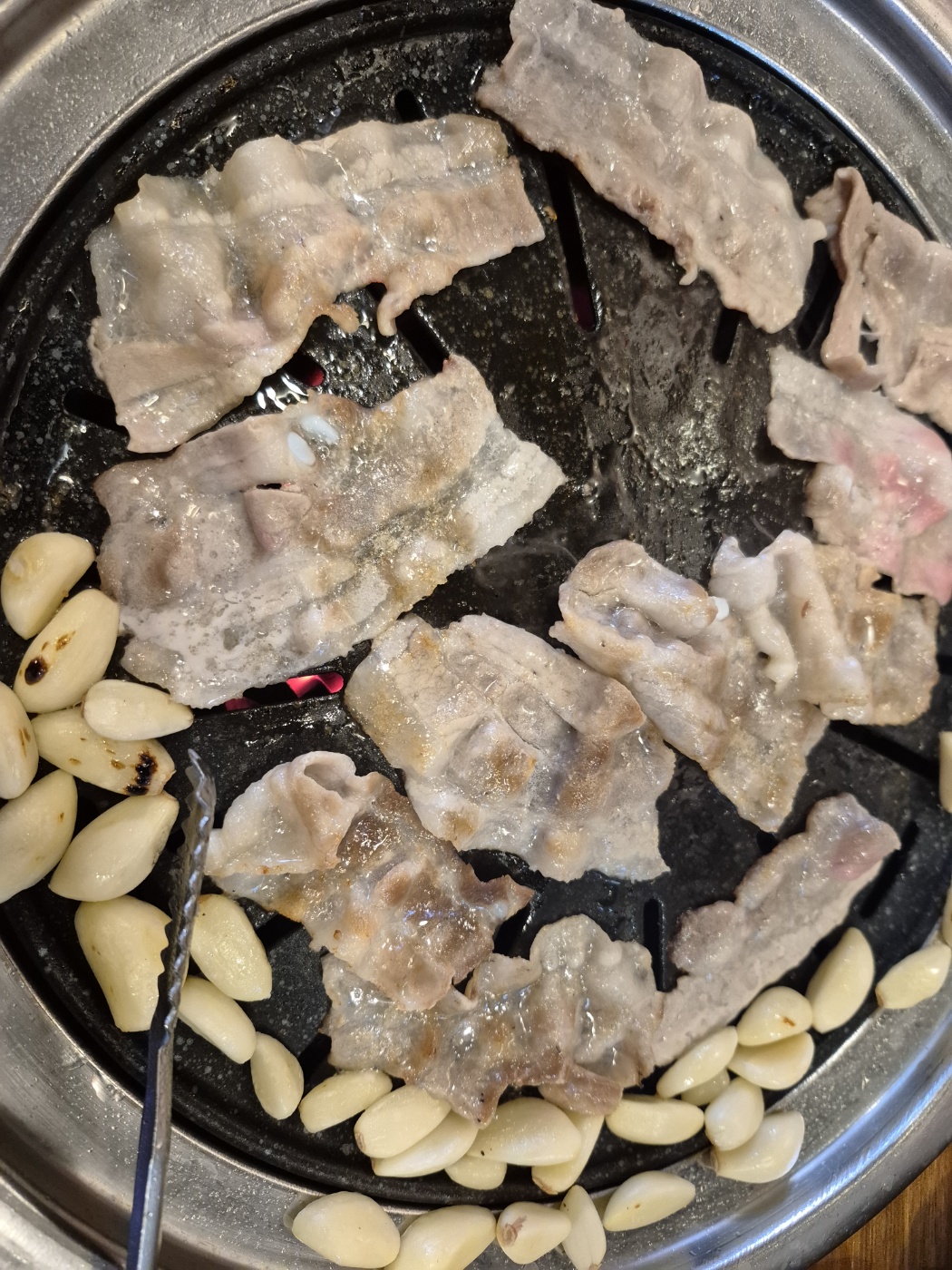 빨리 익는 대패삽겹살을 먼저 굽는다.