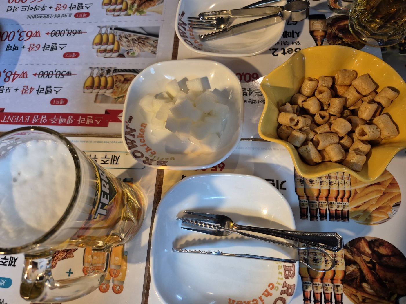 브라운 치킨 삼성점에서 친구들과 치맥을 먹는다.