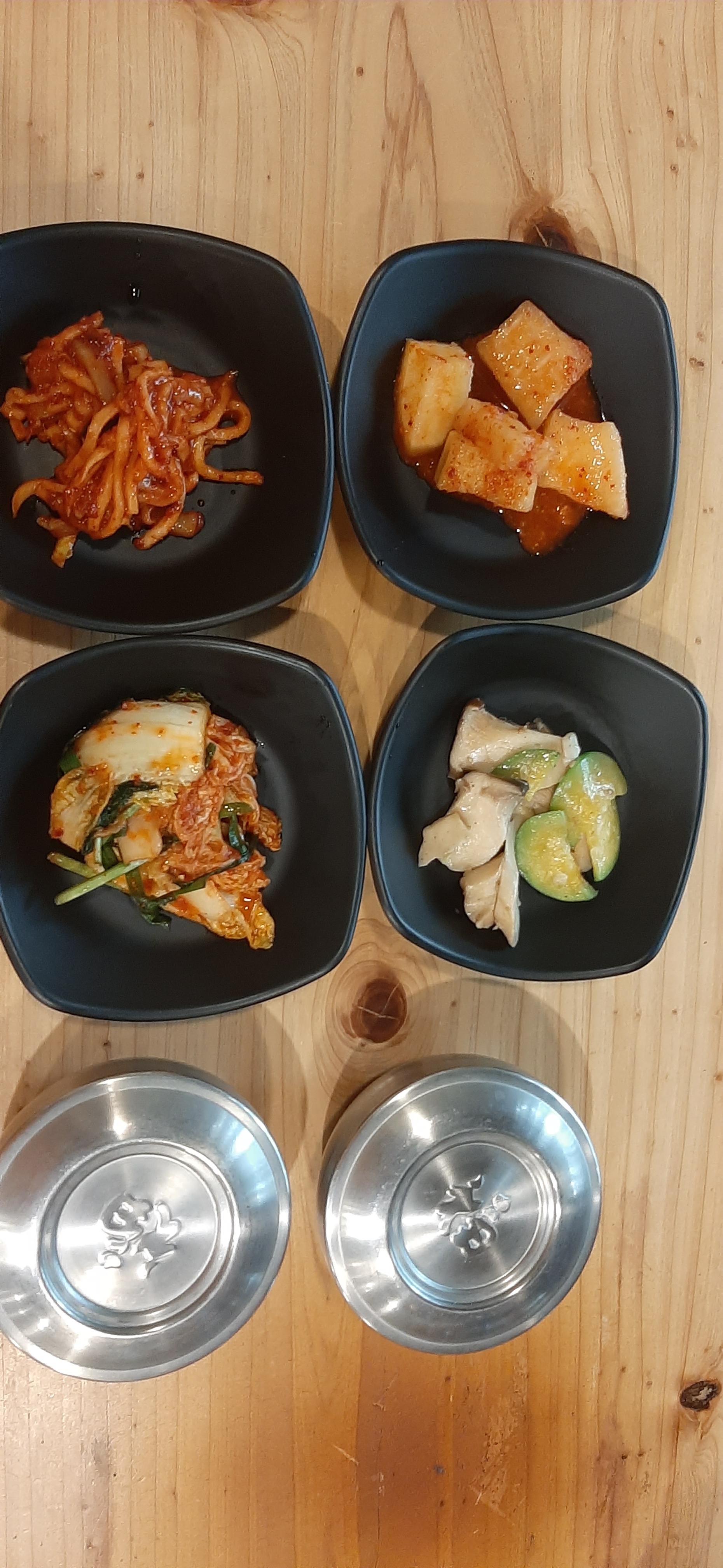 오늘은 날도 으스스하고 비도 내려서 뜨끈한 국물에 밥을 말아서 먹으려고 한우국밥 2개를 주문하고 조금 기다리니 반찬과 한우국밥이 나왔다. 김치 깍두기 호박버섯조림 무생채가 반찬으로 나온다.