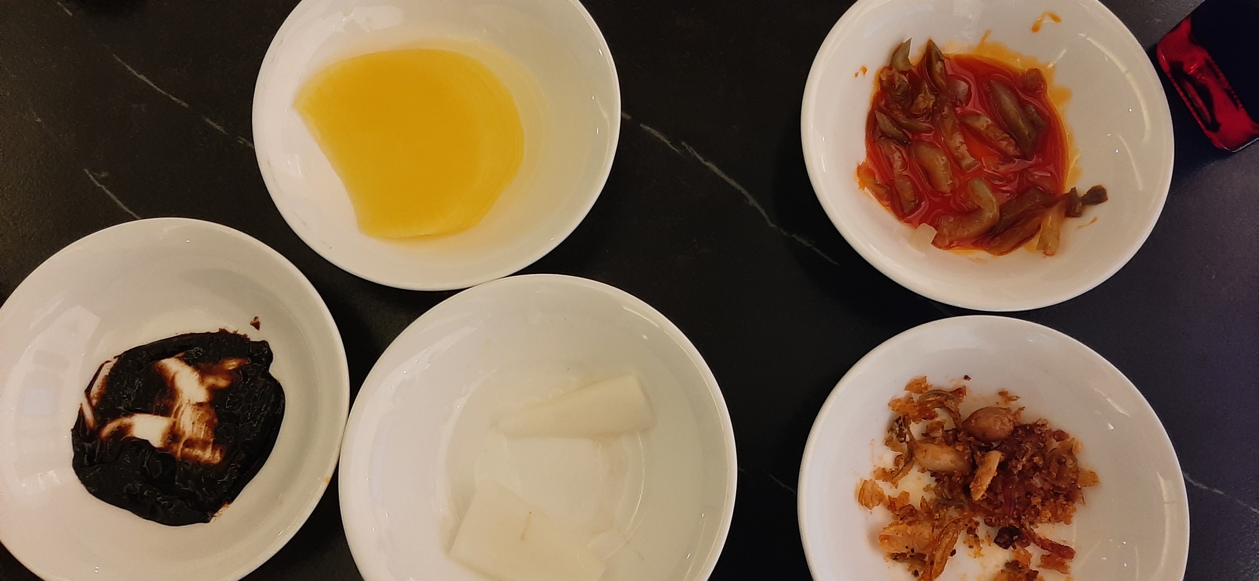 삼성동 맛집인 순대실록에서 연습한, 터치 패드로 어니언 꿔바로우를 주문한다. 요즘에는 터치 패드나 키오스크를 사용 못하면 식당에 갈 수 없는 시대이다. 중식당에 항상 나오는 단무지, 양파, 춘장, 자차이, 볶은 땅콩이 기본으로 나온다. 잠시 기다리니 어니언 꿔바로우가 나온다. 양은 많은 편이다. 적당한 크기로 잘라서 맛을 보는데, 돼지고기보다는 찹쌀의 맛이 더 많이 난다.