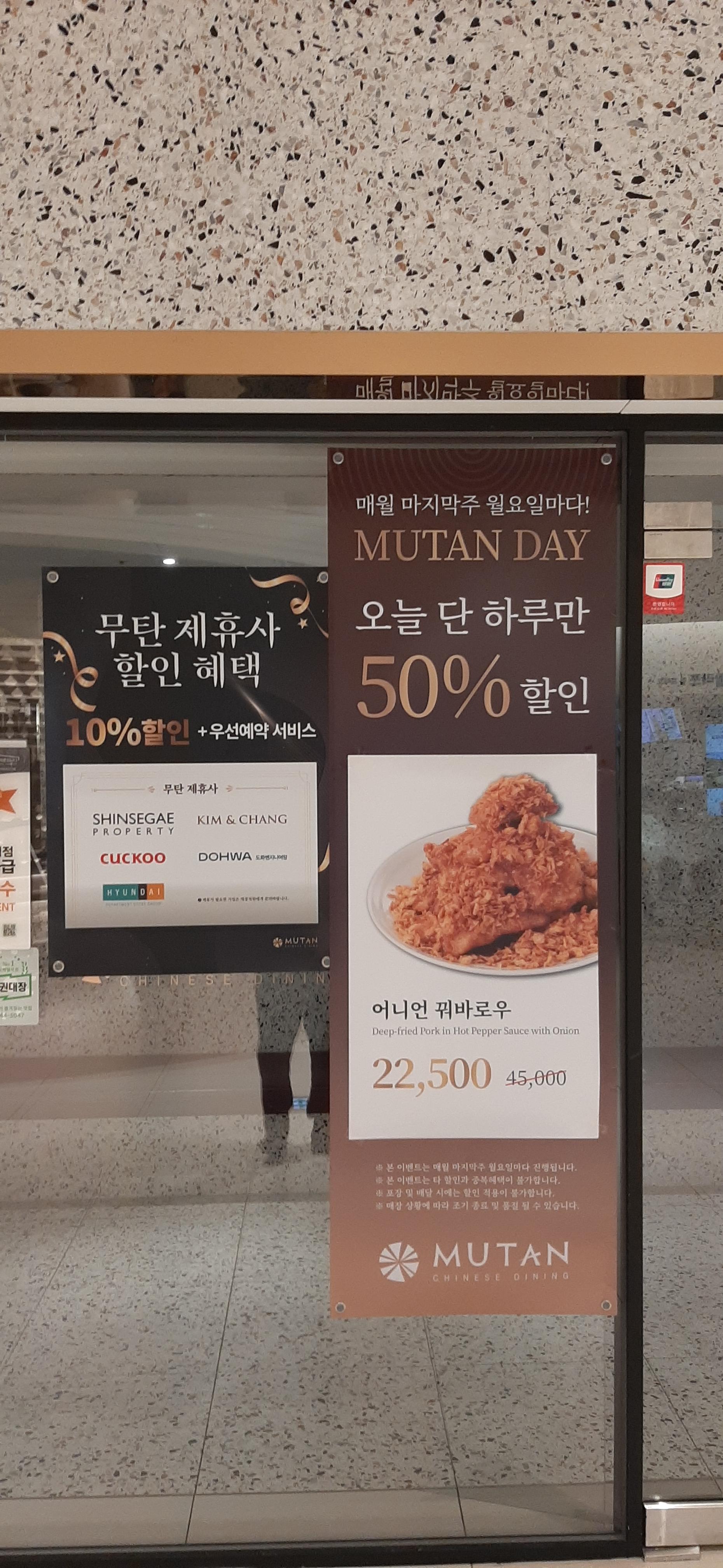 오늘은 2024년 3월 25일 월요일이다. 서울 강남구 삼성동 코엑스 지하 푸드커트에 있는 중식당 무탄에서는 매월 마지막 주 월요일을 무탄 데이라고 하며, 정해진 요리를 50% 할인해서 판매를 한다. 오늘은 45,000에 판매하는 어니언 꿔바로우를 22,500원으로 판매를 하여 먹으러 갔다. 무탄 제휴사 할인 혜택도 있다.