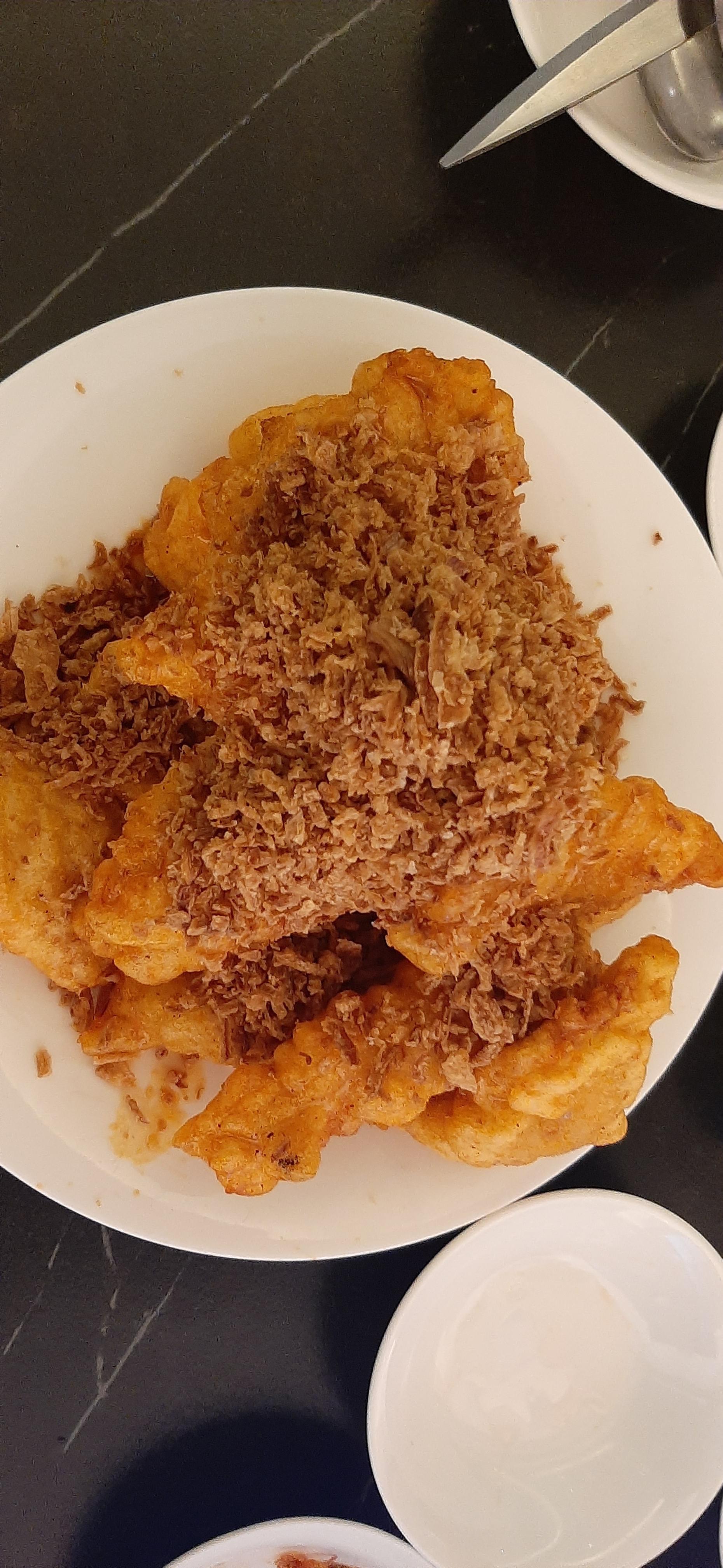 삼성동 맛집인 순대실록에서 연습한, 터치 패드로 어니언 꿔바로우를 주문한다. 요즘에는 터치 패드나 키오스크를 사용 못하면 식당에 갈 수 없는 시대이다. 중식당에 항상 나오는 단무지, 양파, 춘장, 자차이, 볶은 땅콩이 기본으로 나온다. 잠시 기다리니 어니언 꿔바로우가 나온다. 양은 많은 편이다. 적당한 크기로 잘라서 맛을 보는데, 돼지고기보다는 찹쌀의 맛이 더 많이 난다.