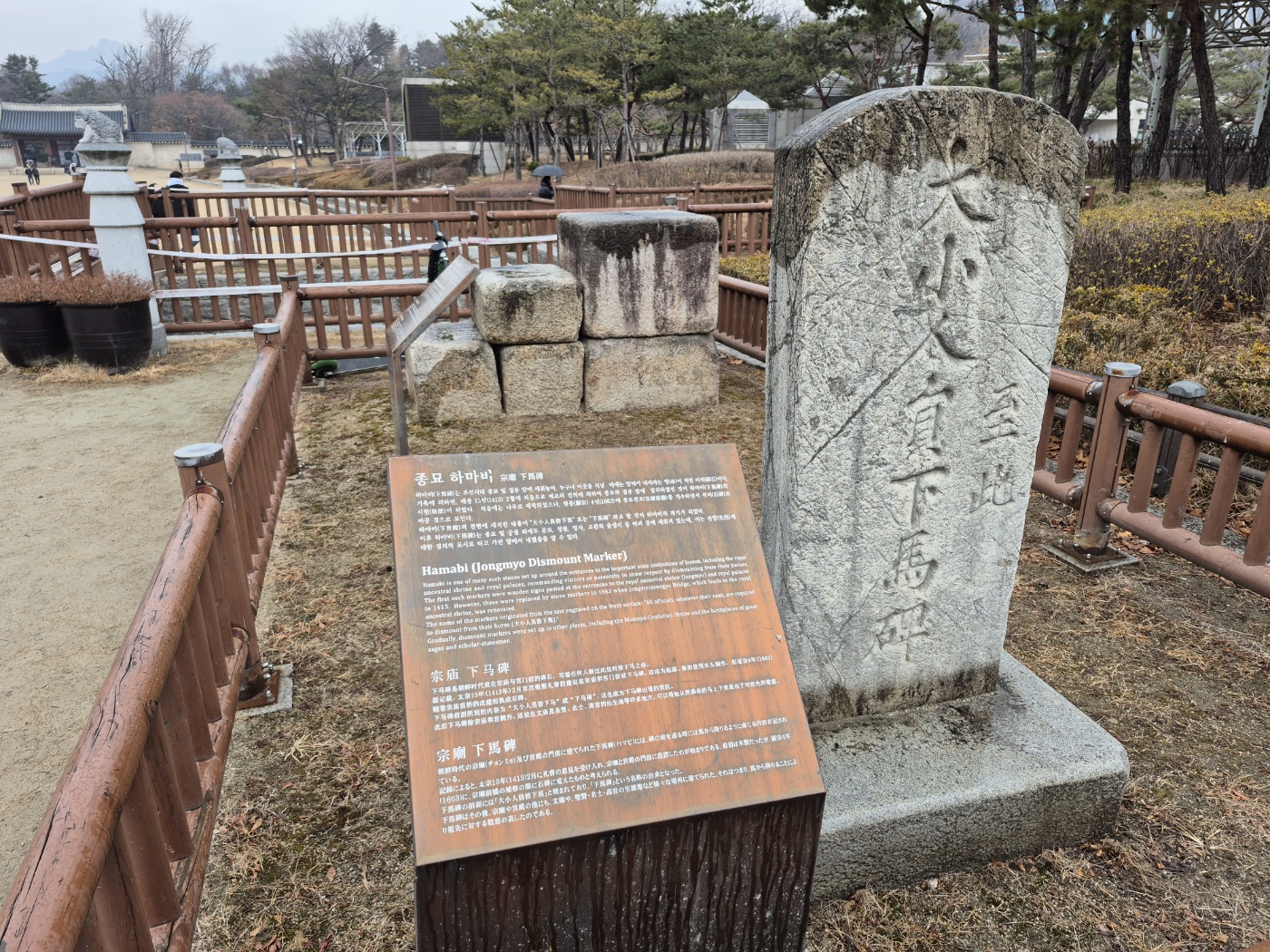 종묘 하마비는 1663년 10월에 세워졌다. 하마비는 종묘 앞을 지날 때는 말에서 내려 경건하게 걸어서 가라는 의미의 비석이다.