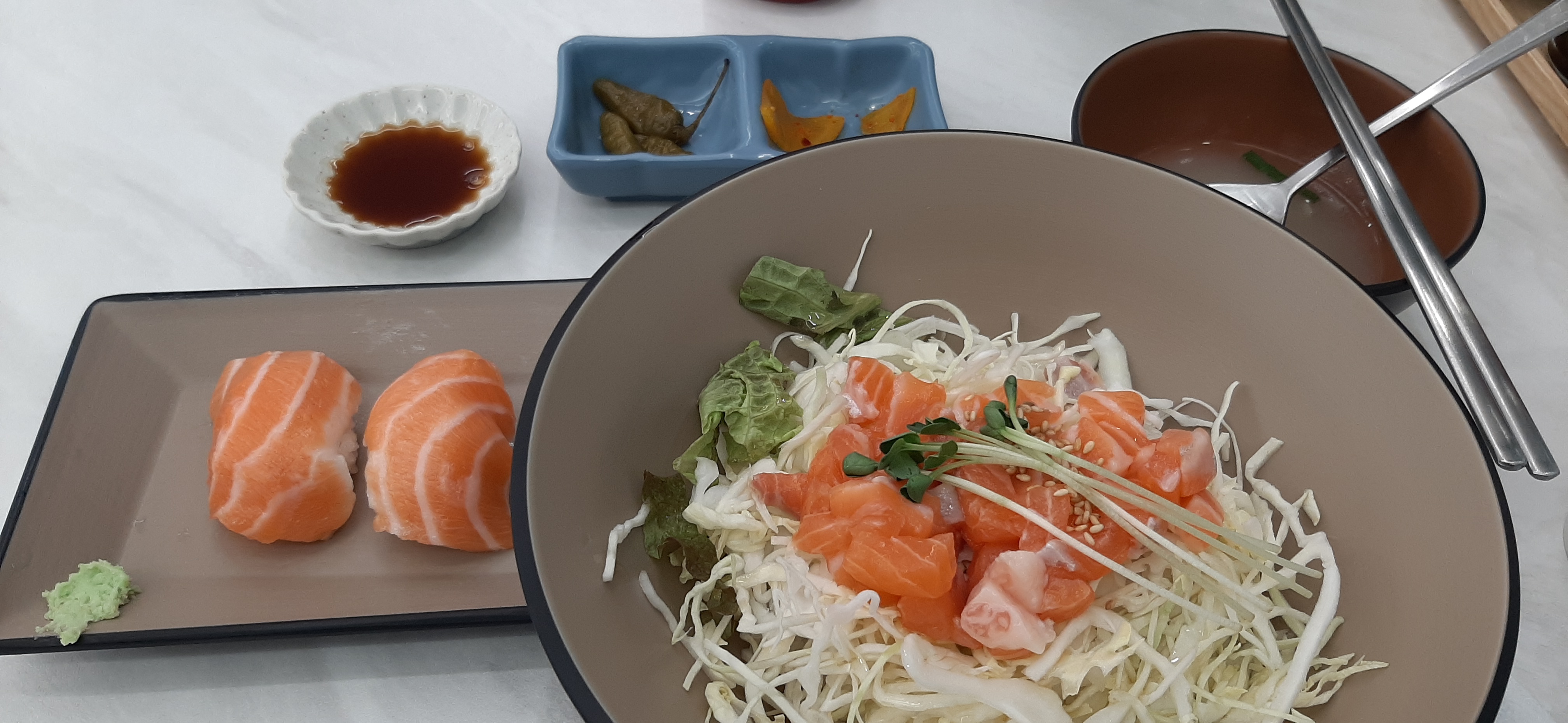 가게는 인테리어가 잘 되어 있어서 깔끔하고 정갈하다. 점심특선으로 8,900원에 파는 연어덮밥세트(연어덮밥 + 연어초밥 2피스)를 주문한다. 가게에는 나이 드신 부부들이 점심식사를 하러 오셨고, 젊은 사람들이 포장을 해서 간다.