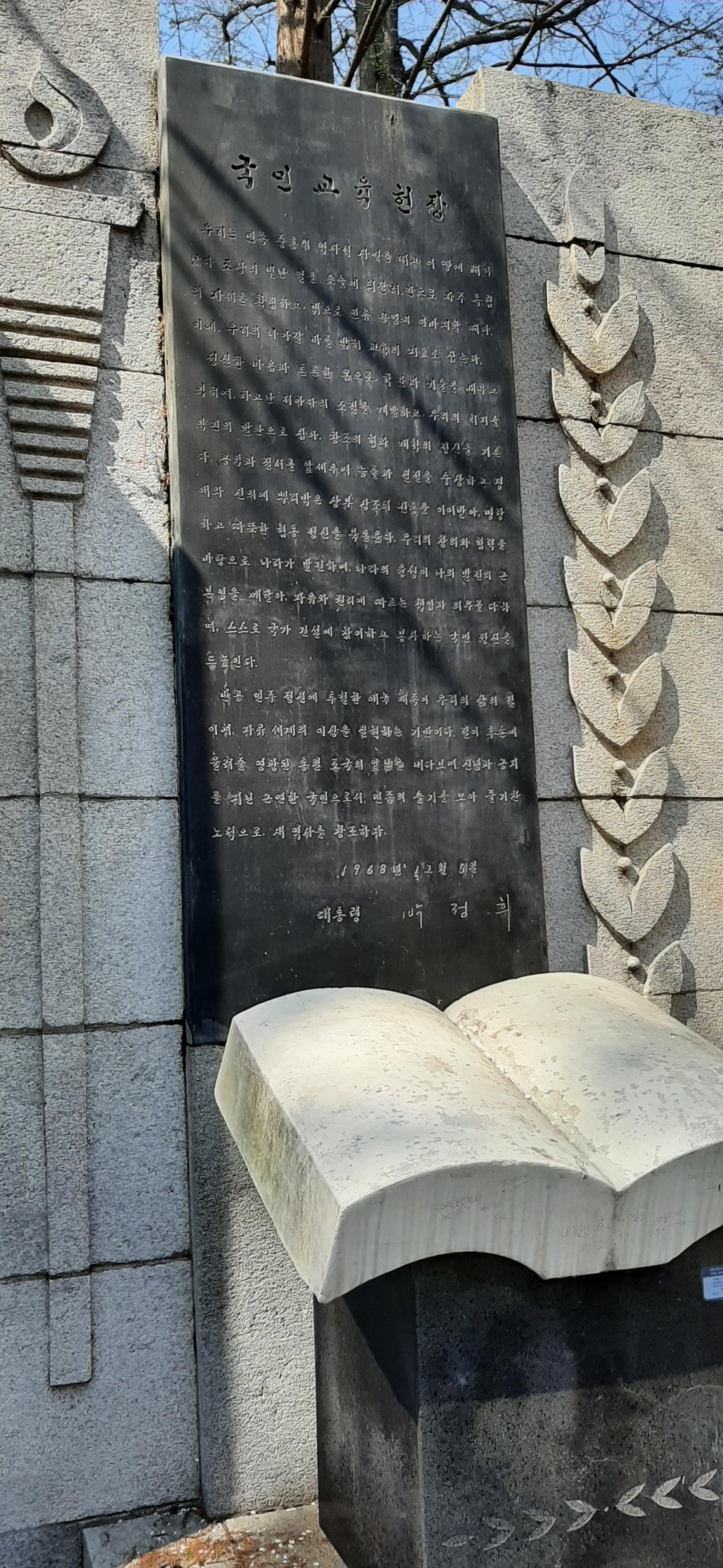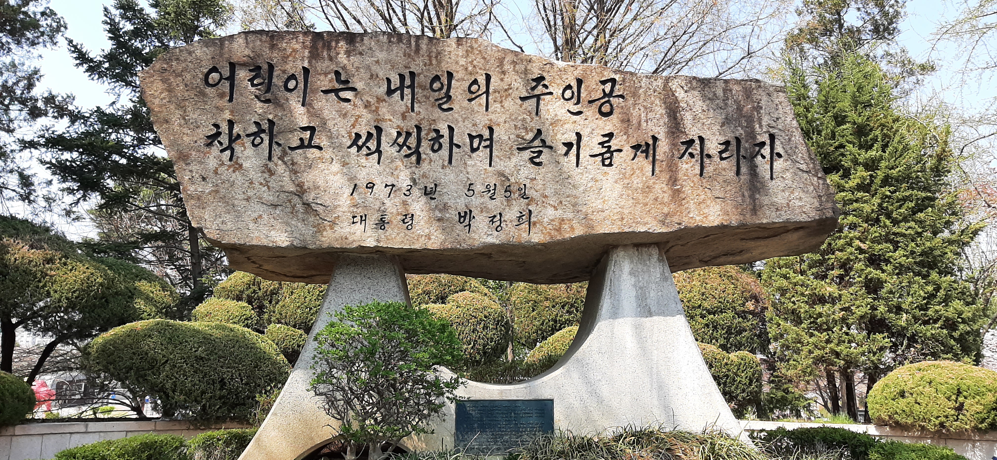 공원 안에는 젊은 연인들, 친구들, 어린아이들을 동반한 부모들이 많고, 나만 혼자이다. 어린이대공원 입구에 박정희 대통령이 어린아이들을 사랑하는 마음으로 쓴 글이 큰 돌에 새겨 있다. 내가 국민학교 다닐 때 만든 국민교육헌장 반포 기념비도 있다. 국민교육헌장을 반포하던 날 선생님께서 오셔서 국민교육헌장을 나누어주면서, 처음부터 끝까지 외우는 사람만 집에 가라고 했던 기억이 난다. 나는 아주 늦게 집에 갔다.