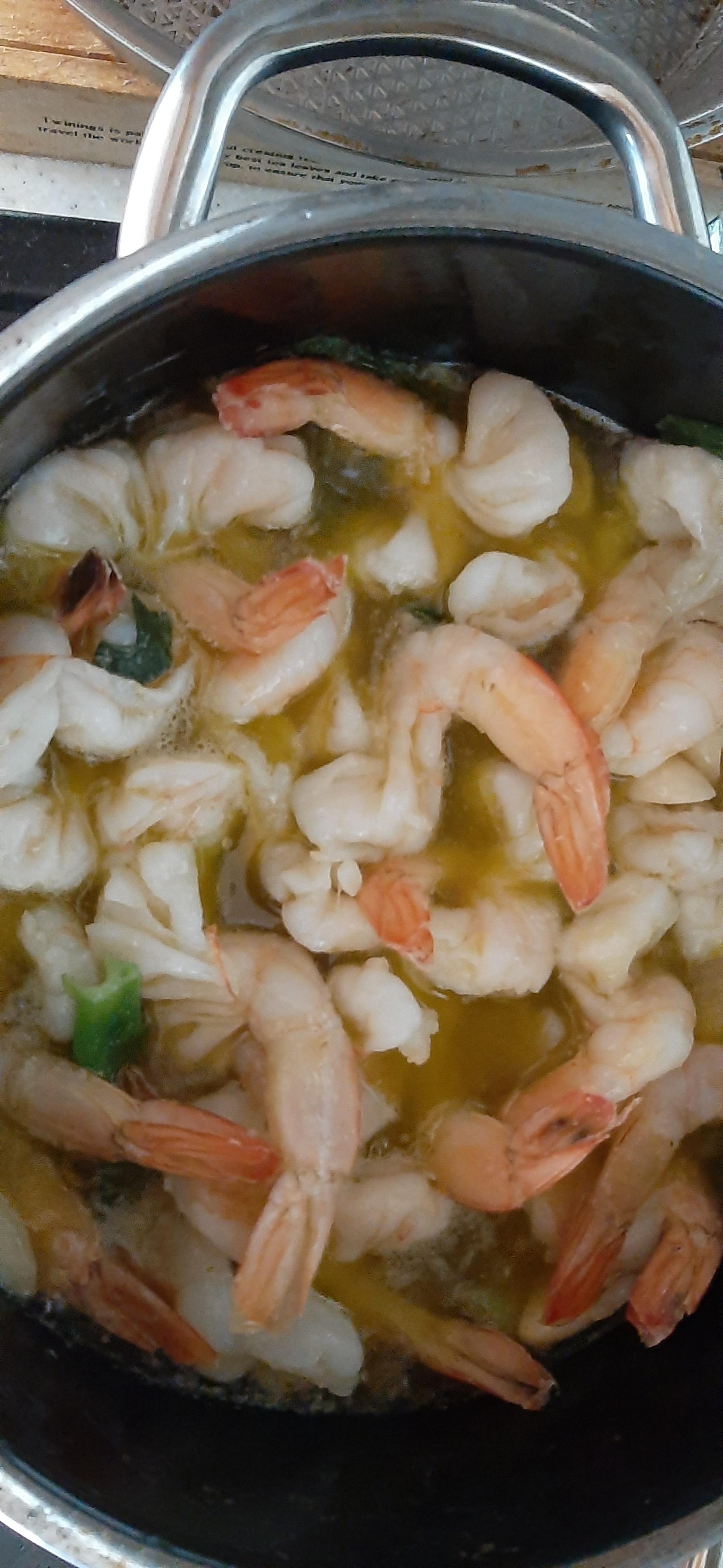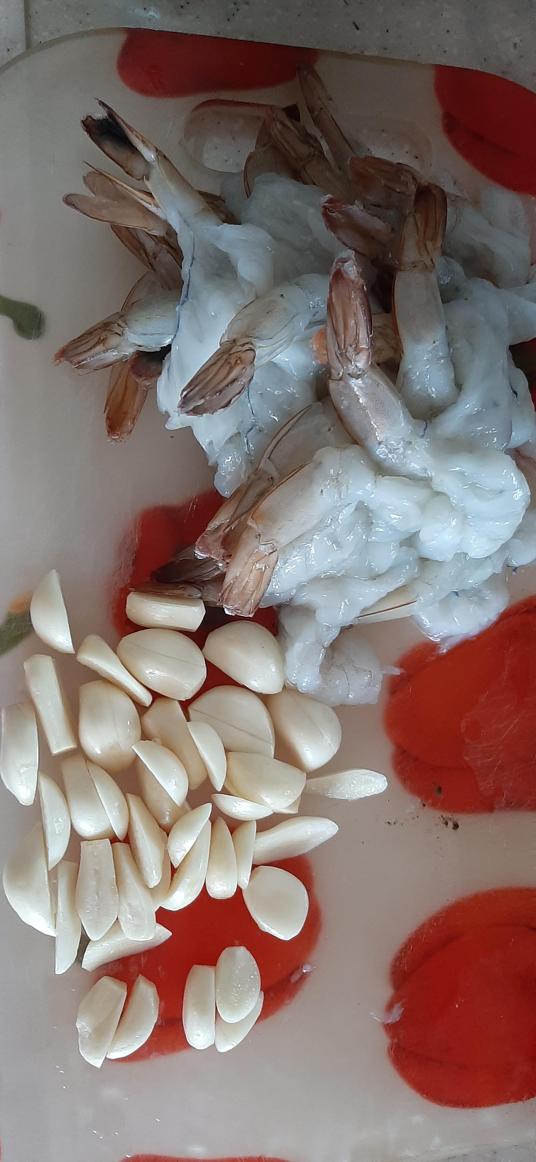 추석에 먹으려고 사두었던 냉동새우 약 500그램을 꺼내서, 찬물에 담가 녹인다. 마늘 15알을 자르고, 대파도 잘라서 준비한다. 냄비에 올리브오일을 약 300CC 정도 넣고, 마늘과 대파를 넣어서 끓이고, 기름이 끓으면 해동한 새우를 넣어서 익힌다. 소금으로 간을 한다.