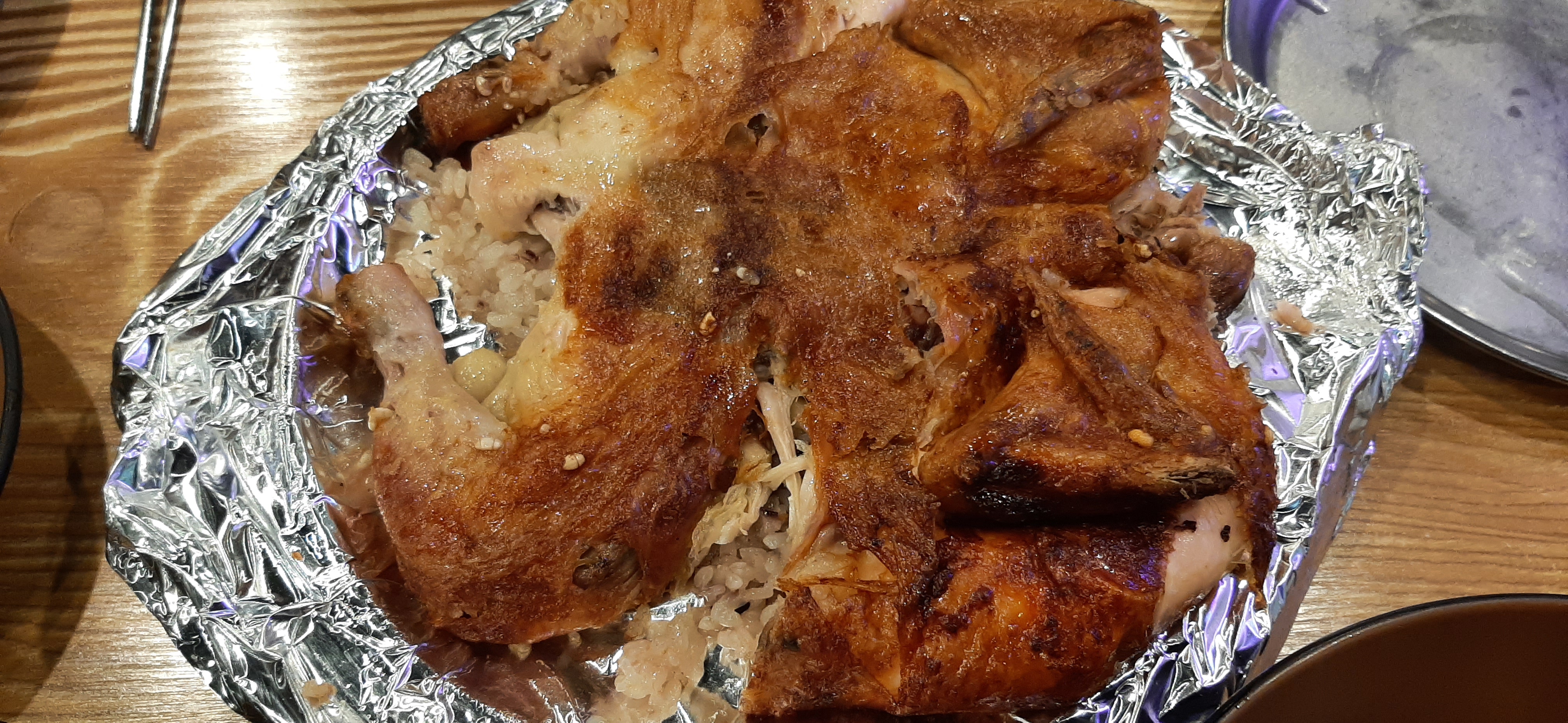 닭장작구이는 닭을 큰 꼬치에 여러 마리 끼워서, 장작불에 굽고, 돌솥에 누룽지를 만들어서, 장작에 구운 닭을 누룽지 위에 얹어서 나오는데, 누룽지도 맛있고, 기름이 쪽 빠진 닭도 담백하고 맛있다. 닭장작구이를 처음 먹는 나는 신이 나서 먹는다. 산행을 하여 목도 말라서, 시원한 생맥주도 술술 들어간다. 기분 좋다.