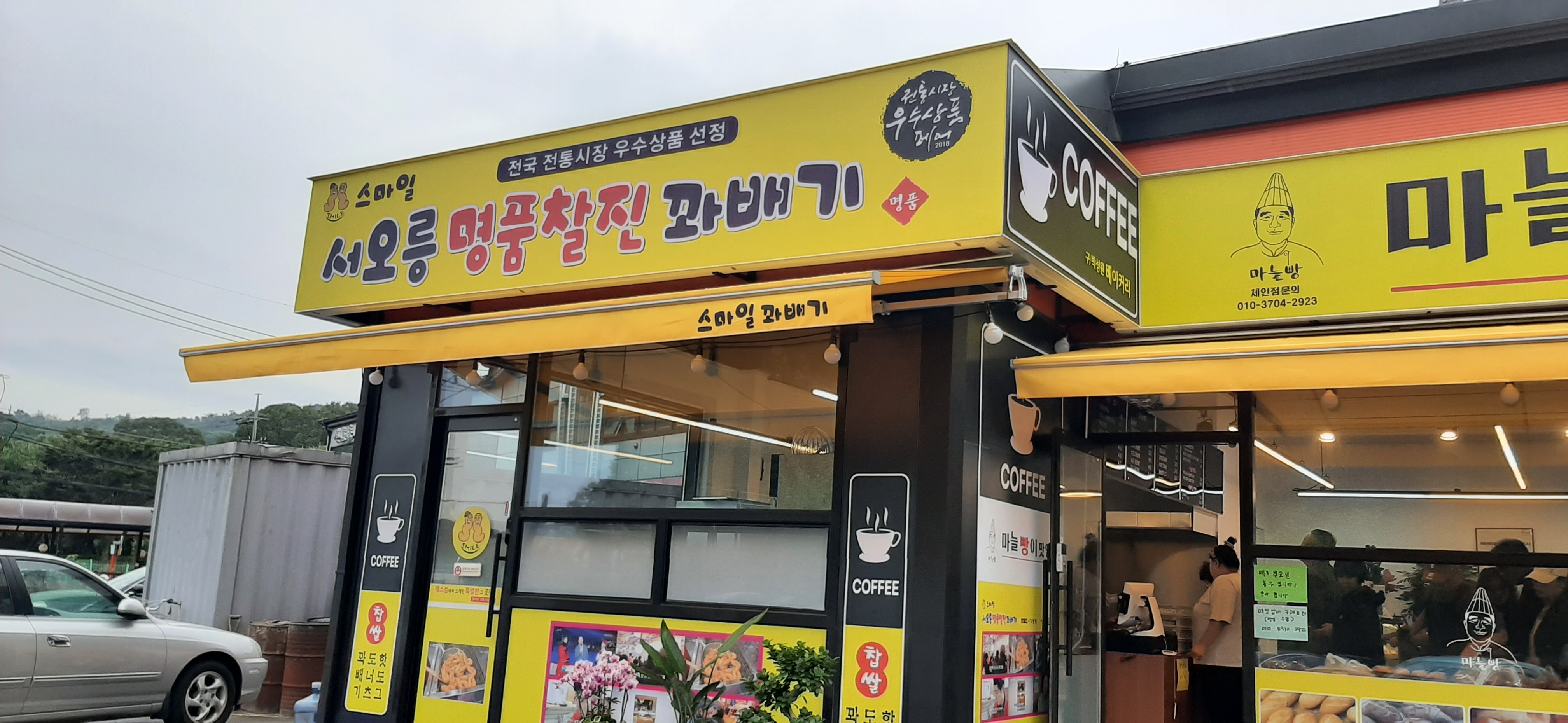 커피를 마시려고 신호등 장작구이 바로 옆에 있는 스마일서오릉 명품 찰진 꽈배기&미늘빵이 맛있다 가게로 들어가서 커피와 빵을 먹는다.
