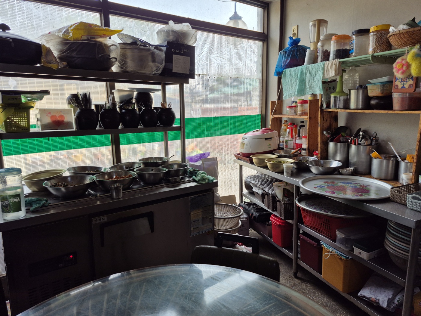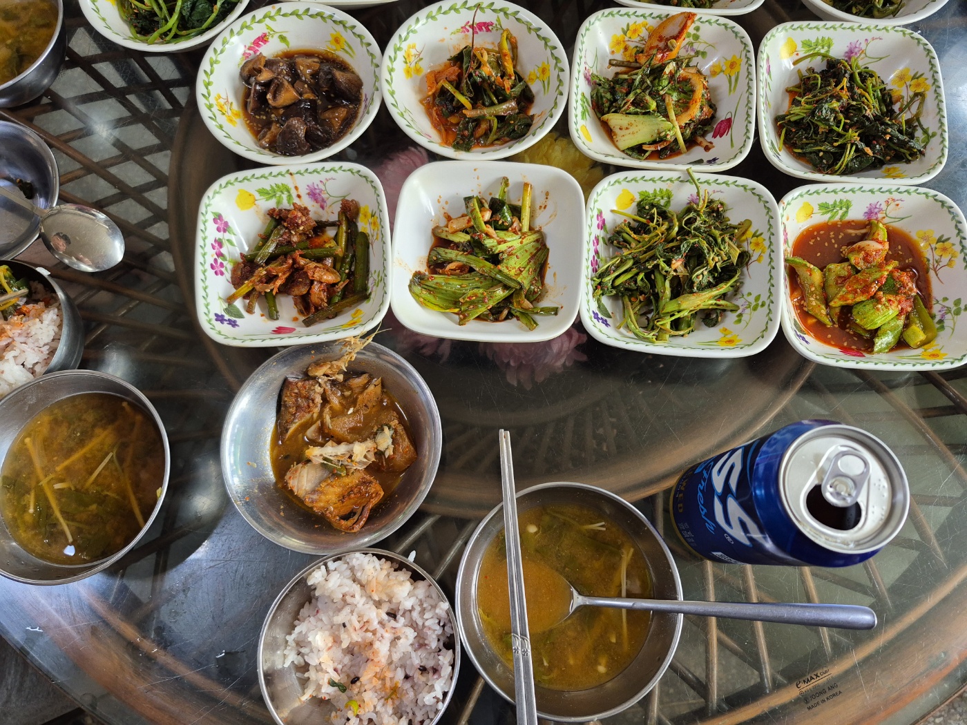 노 부부와 가볍게 인사를 한다. 주인 할머니는 나물 반찬을 그릇에 담아서 내주시고, 나는 수저를 테이블에 놓는다.