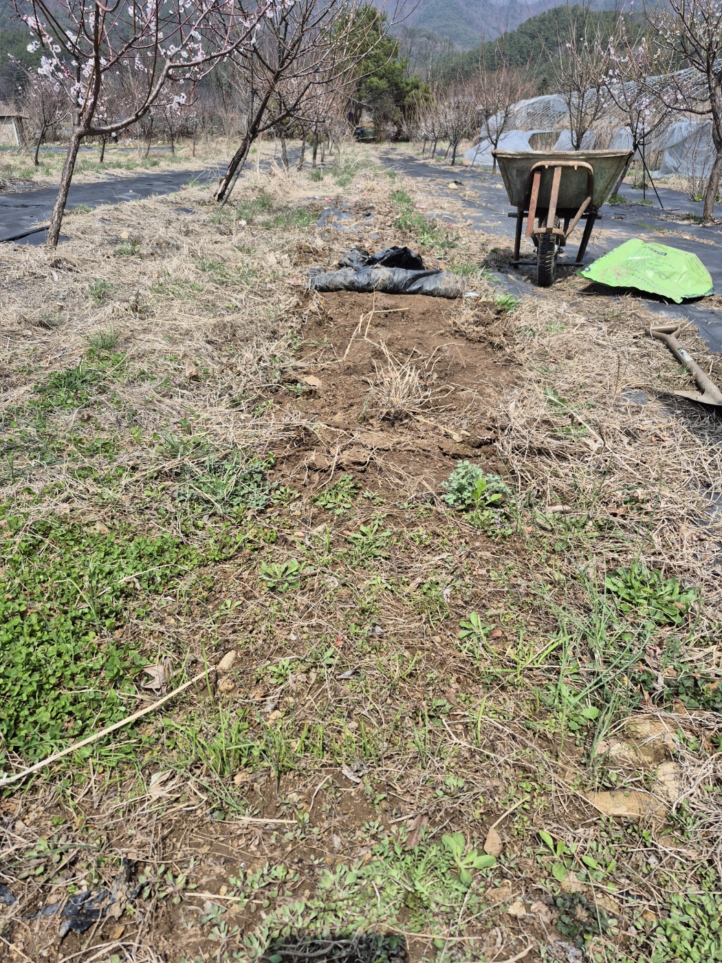 후배는 그린얼룩 찰옥수수 종자를 심고, 나는 전 주에 갈아놓은 밭에 검정비닐을 씌운다. 바람이 세게 불어서 매실나무 사이에 깔아 둔 제초매트가 날아간 곳을 다시 정리한다.