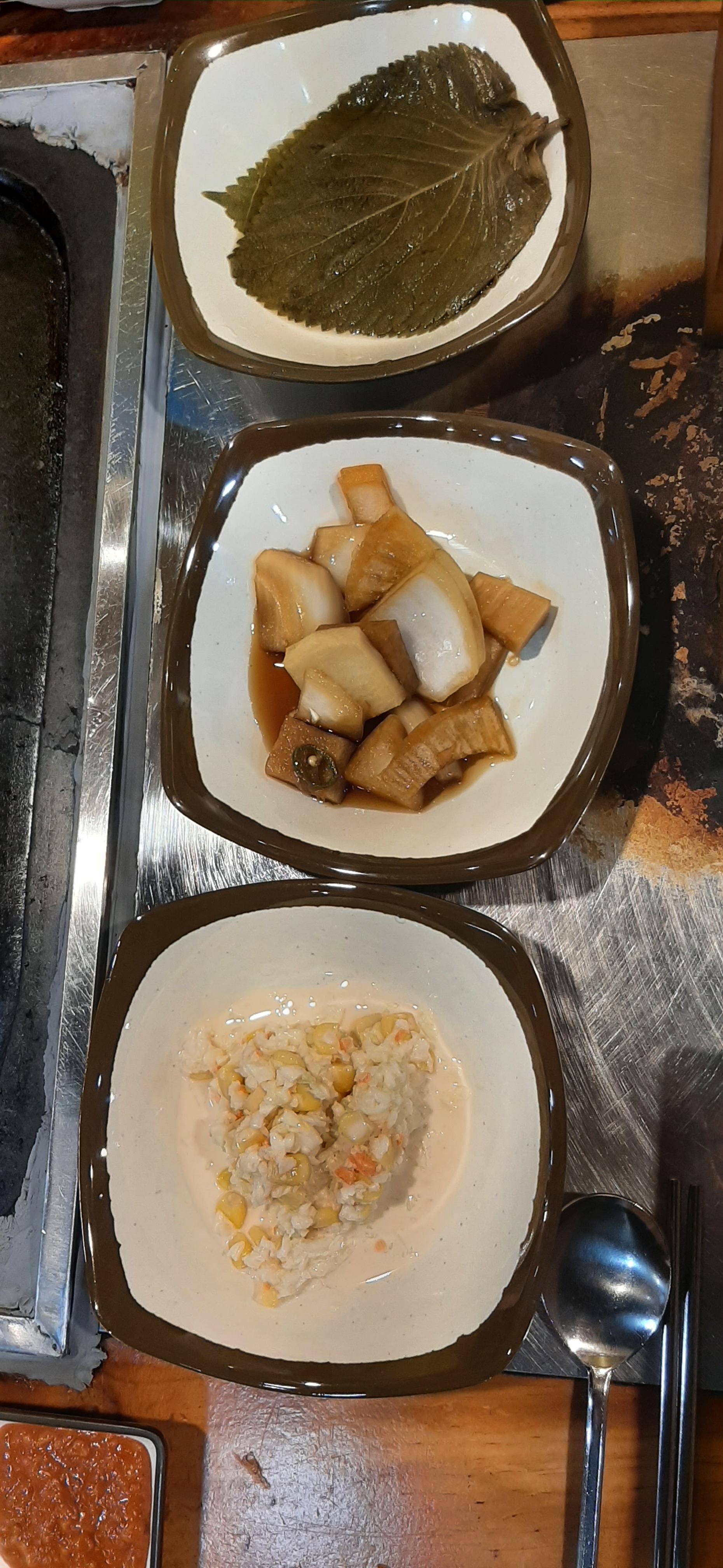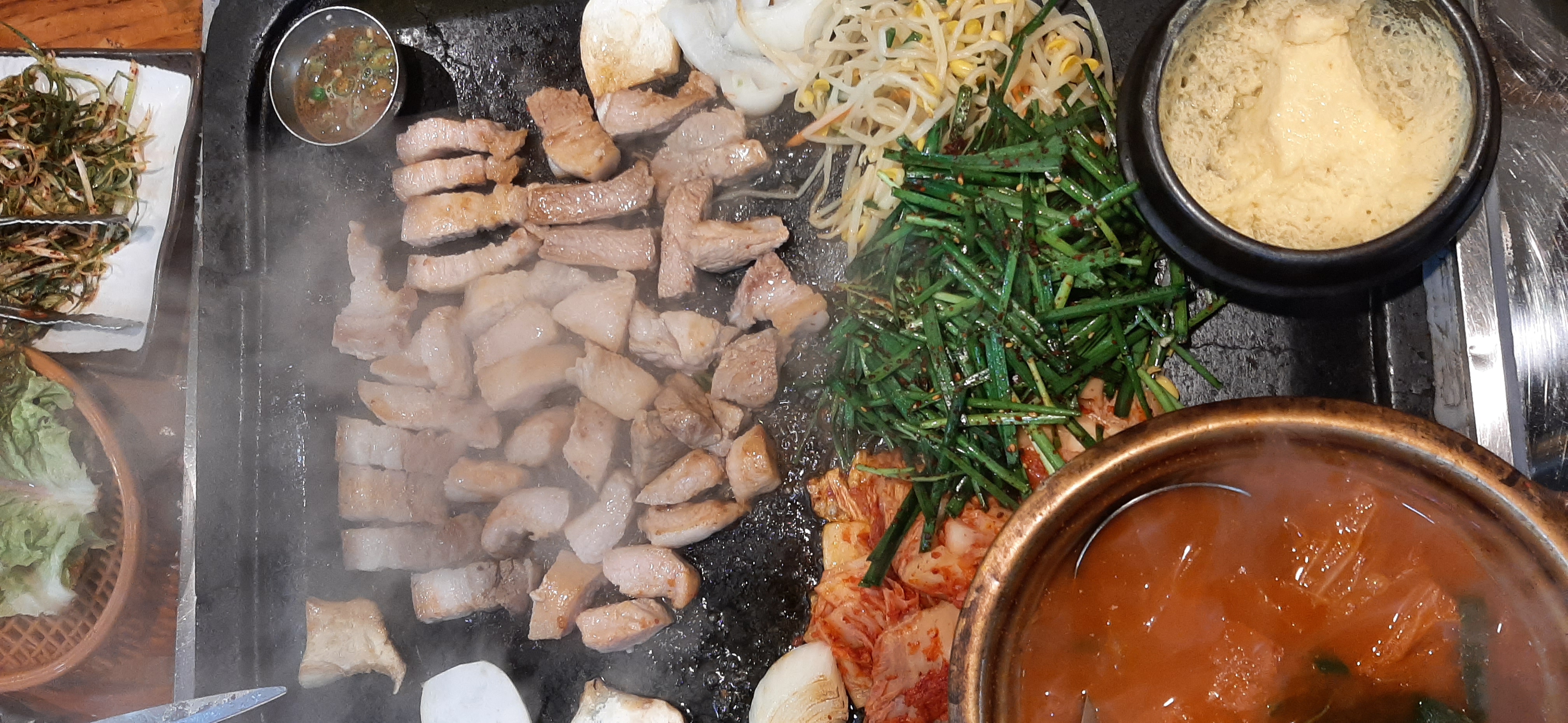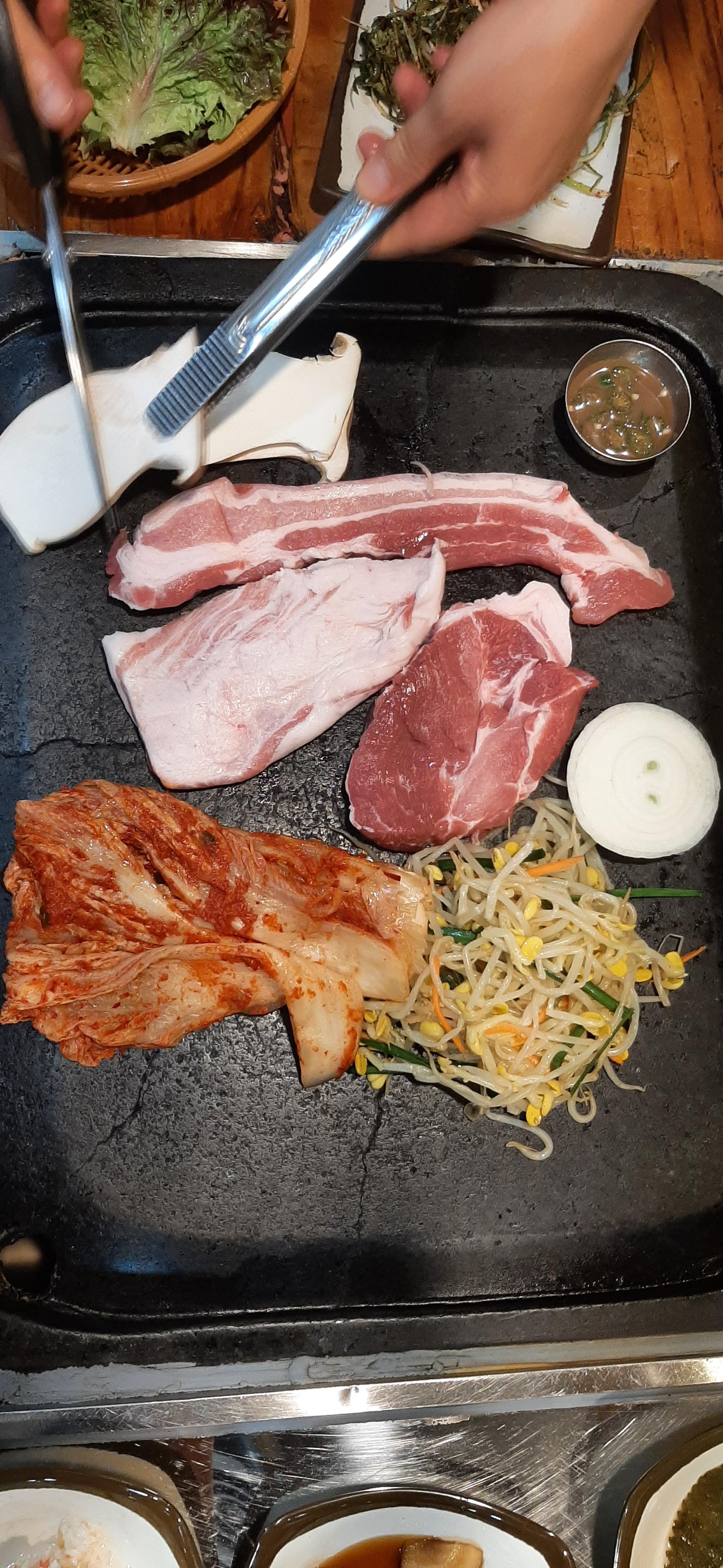테이블에 설치된 아주 큰 철판에 김치, 콩나물, 버섯, 제주도 멸치젓인 맬젓을 올리고, 우리가 주문한 제주 흑돼지를 올린다. 기본 반찬으로 깻잎장아찌, 양파간장절임, 옥수수 샐러드가 나온다.