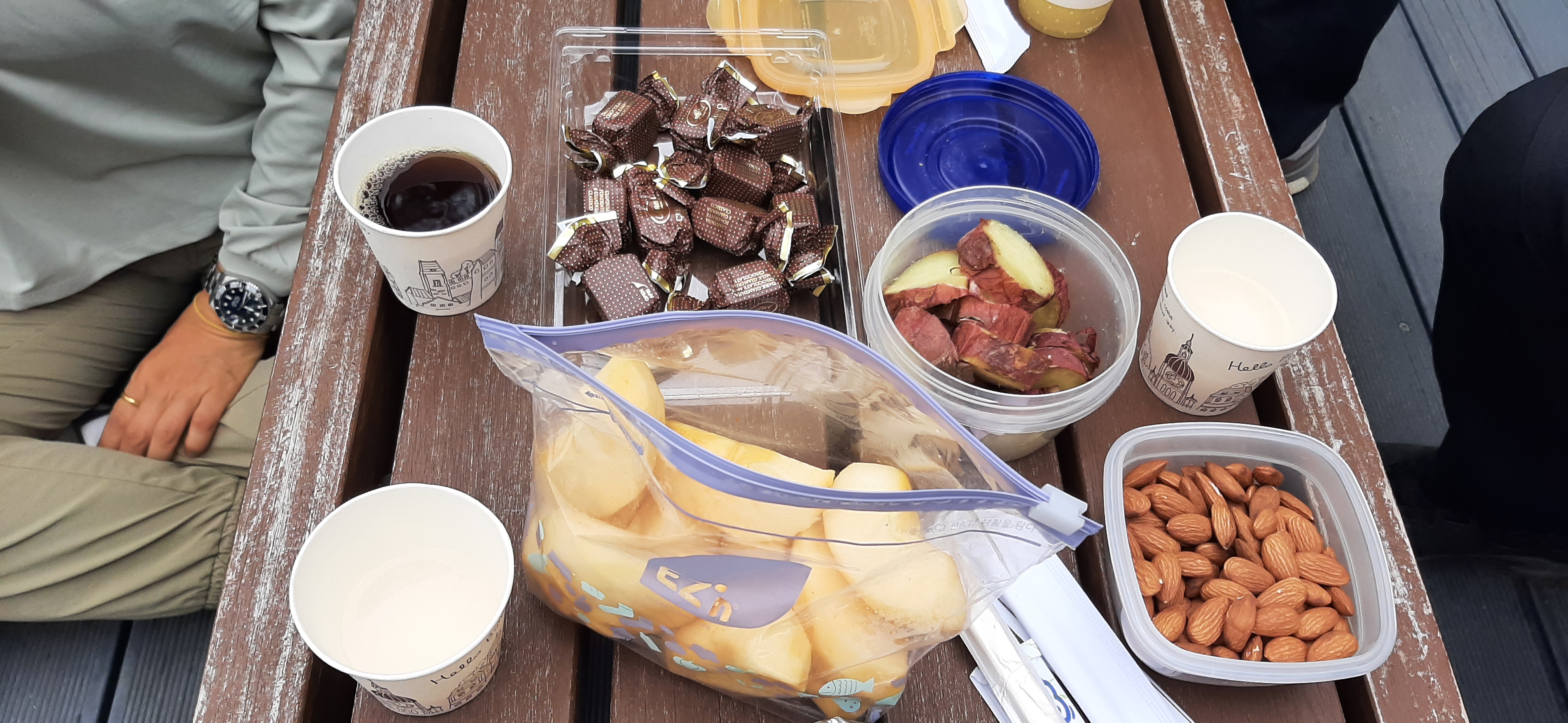 봉산 편백숲 전망대에서 쉬어가기로 한다. 오늘 산행은 남자 3명, 여자 3명으로 마치 묻지 마 관광을 하는 것처럼 짝이 맡는다. 여자들과 산행을 하면 좋은 것이 뭔가 먹을 것을 싸 온다. 남자들은 기껏해야 본인이 마실 물 정도 챙겨 온다. 홍은 사과를 가져오고, 안은 고구마순 부침개를 가져오고, 김은 이탈리아 초콜릿을 가져와서 푸짐하다.